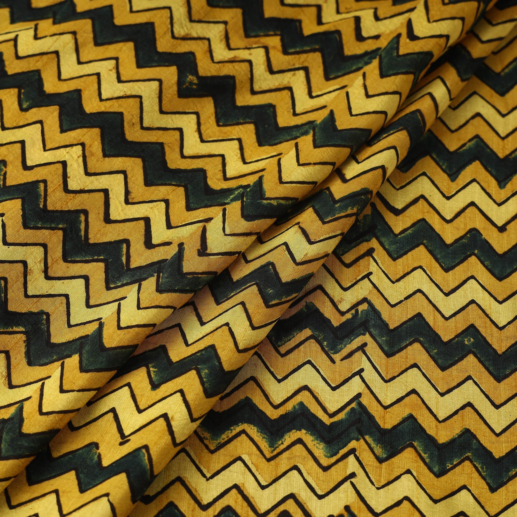 Yellow ajrakh fabric is hand block printed using traditional techniques and natural dyes from Kutch, showcasing Gujarat’s textile heritage through detailed patterns and rich tones. Crafted on dola silk cotton, it offers a smooth drape and comfortable wear. The added zari border gives it an elegant finish, making it ideal for kurtas, shirts, dresses or stylish home decor pieces.