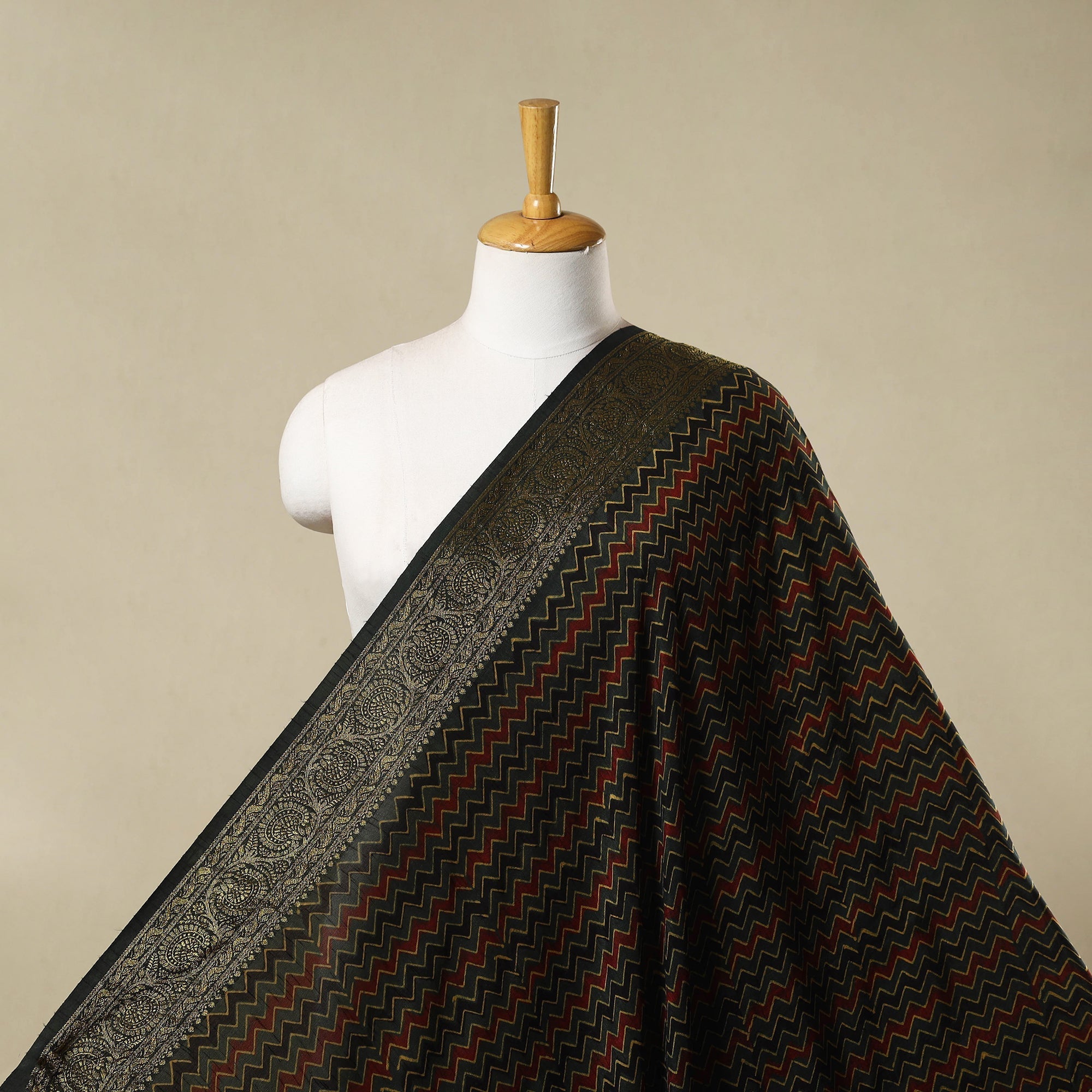 Green ajrakh fabric is hand block printed using traditional techniques and natural dyes from Kutch, showcasing Gujarat’s textile heritage through detailed patterns and rich tones. Crafted on dola silk cotton, it offers a smooth drape and comfortable wear. The added zari border gives it an elegant finish, making it ideal for kurtas, shirts, dresses or stylish home decor pieces.