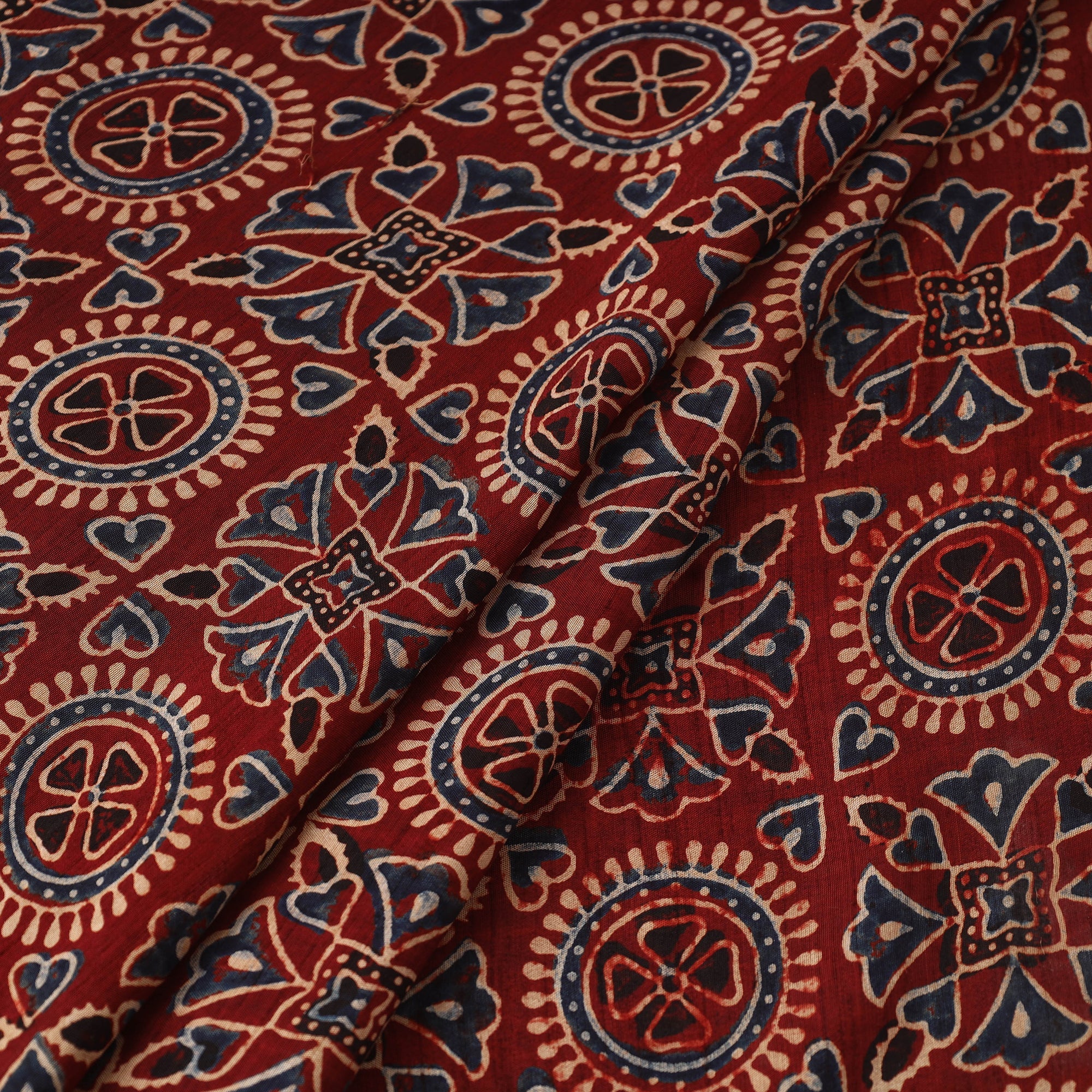 Red ajrakh fabric is hand block printed using traditional techniques and natural dyes from Kutch, showcasing Gujarat’s textile heritage through detailed patterns and rich tones. Crafted on dola silk cotton, it offers a smooth drape and comfortable wear. The added zari border gives it an elegant finish, making it ideal for kurtas, shirts, dresses or stylish home decor pieces.