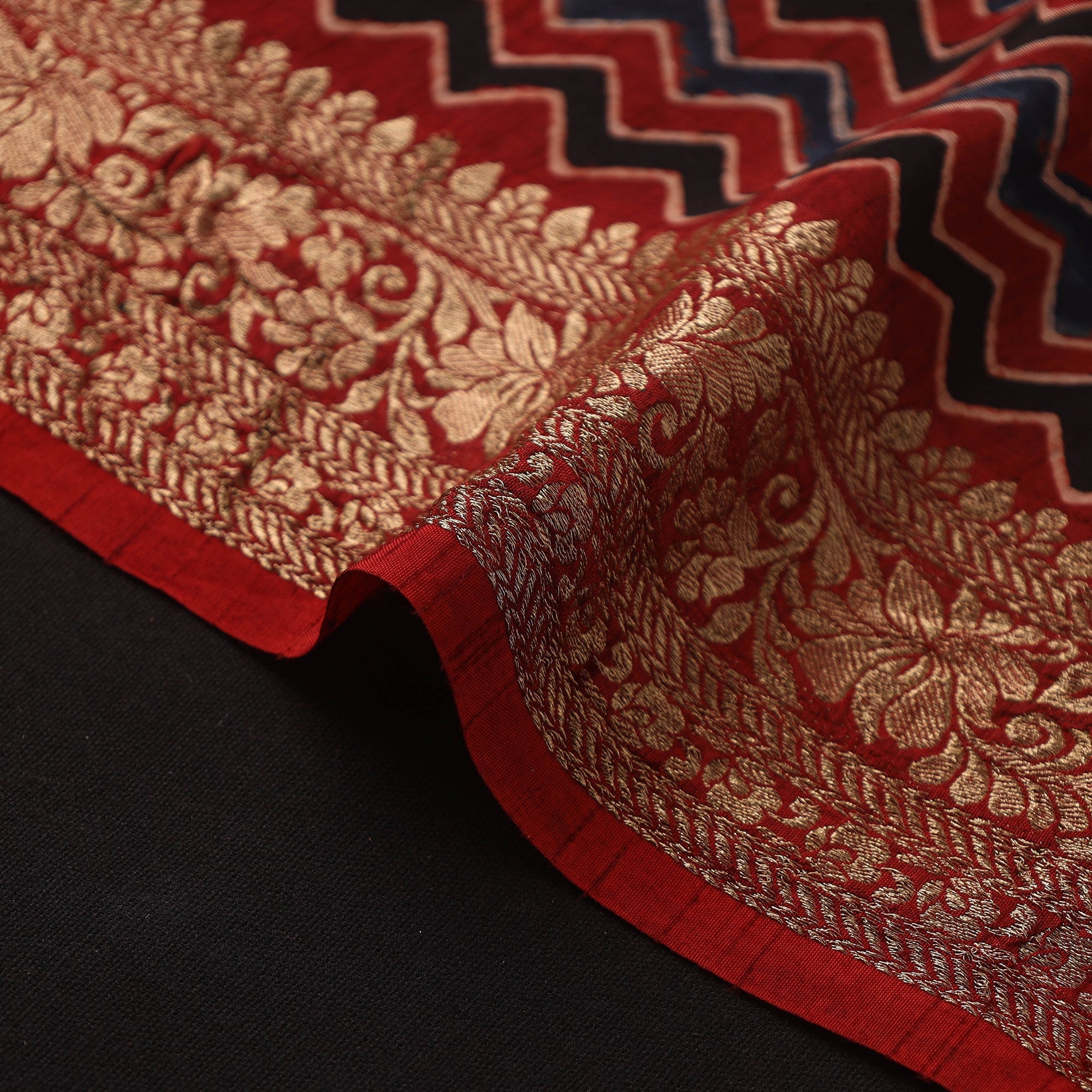 Red ajrakh fabric is hand block printed using traditional techniques and natural dyes from Kutch, showcasing Gujarat’s textile heritage through detailed patterns and rich tones. Crafted on dola silk cotton, it offers a smooth drape and comfortable wear. The added zari border gives it an elegant finish, making it ideal for kurtas, shirts, dresses or stylish home decor pieces.