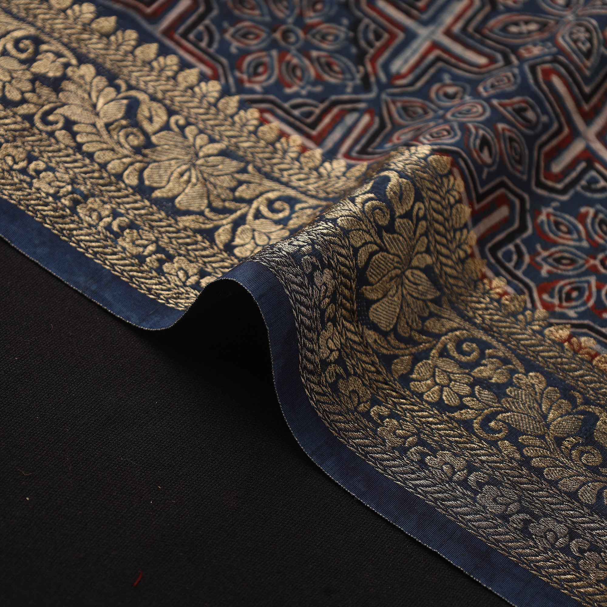 Blue ajrakh fabric is hand block printed using traditional techniques and natural dyes from Kutch, showcasing Gujarat’s textile heritage through detailed patterns and rich tones. Crafted on dola silk cotton, it offers a smooth drape and comfortable wear. The added zari border gives it an elegant finish, making it ideal for kurtas, shirts, dresses or stylish home decor pieces.