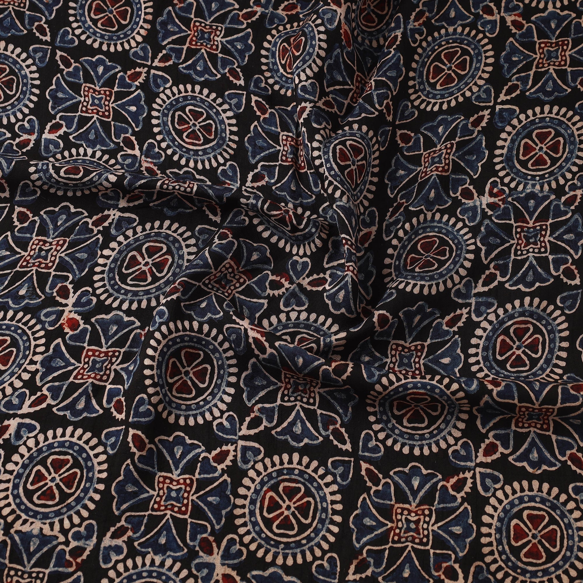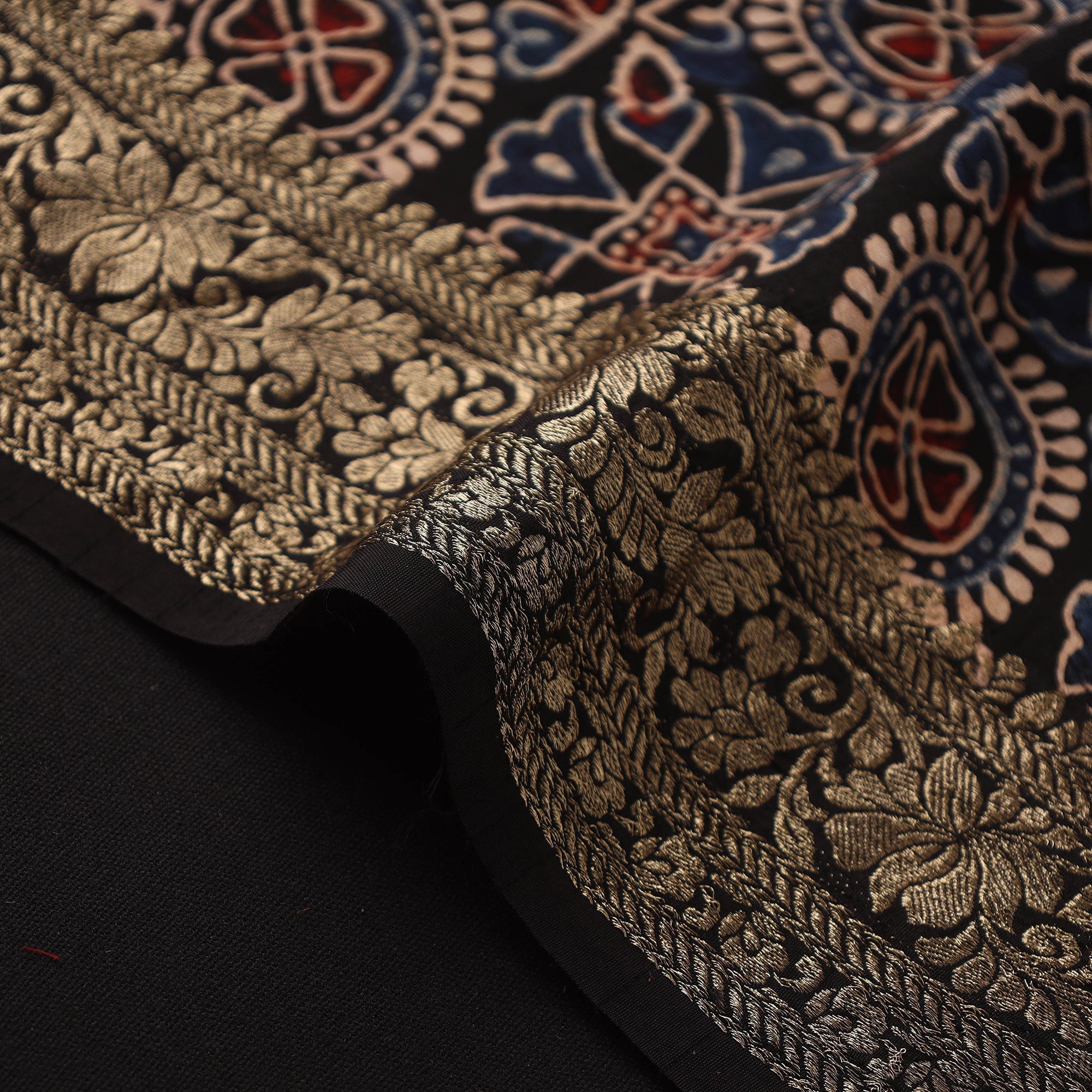 Black ajrakh fabric is hand block printed using traditional techniques and natural dyes from Kutch, showcasing Gujarat’s textile heritage through detailed patterns and rich tones. Crafted on dola silk cotton, it offers a smooth drape and comfortable wear. The added zari border gives it an elegant finish, making it ideal for kurtas, shirts, dresses or stylish home decor pieces.