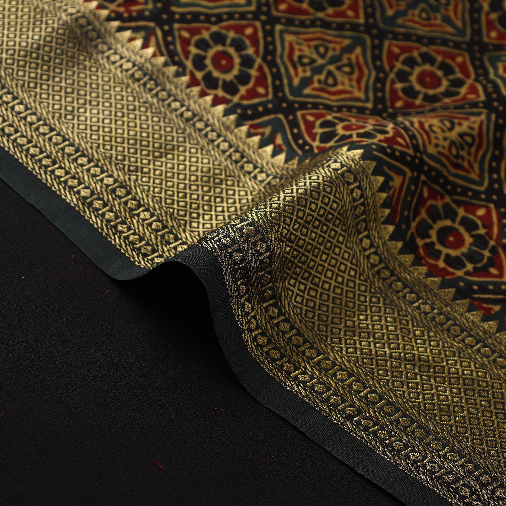 Green ajrakh fabric is hand block printed using traditional techniques and natural dyes from Kutch, showcasing Gujarat’s textile heritage through detailed patterns and rich tones. Crafted on dola silk cotton, it offers a smooth drape and comfortable wear. The added zari border gives it an elegant finish, making it ideal for kurtas, shirts, dresses or stylish home decor pieces.
