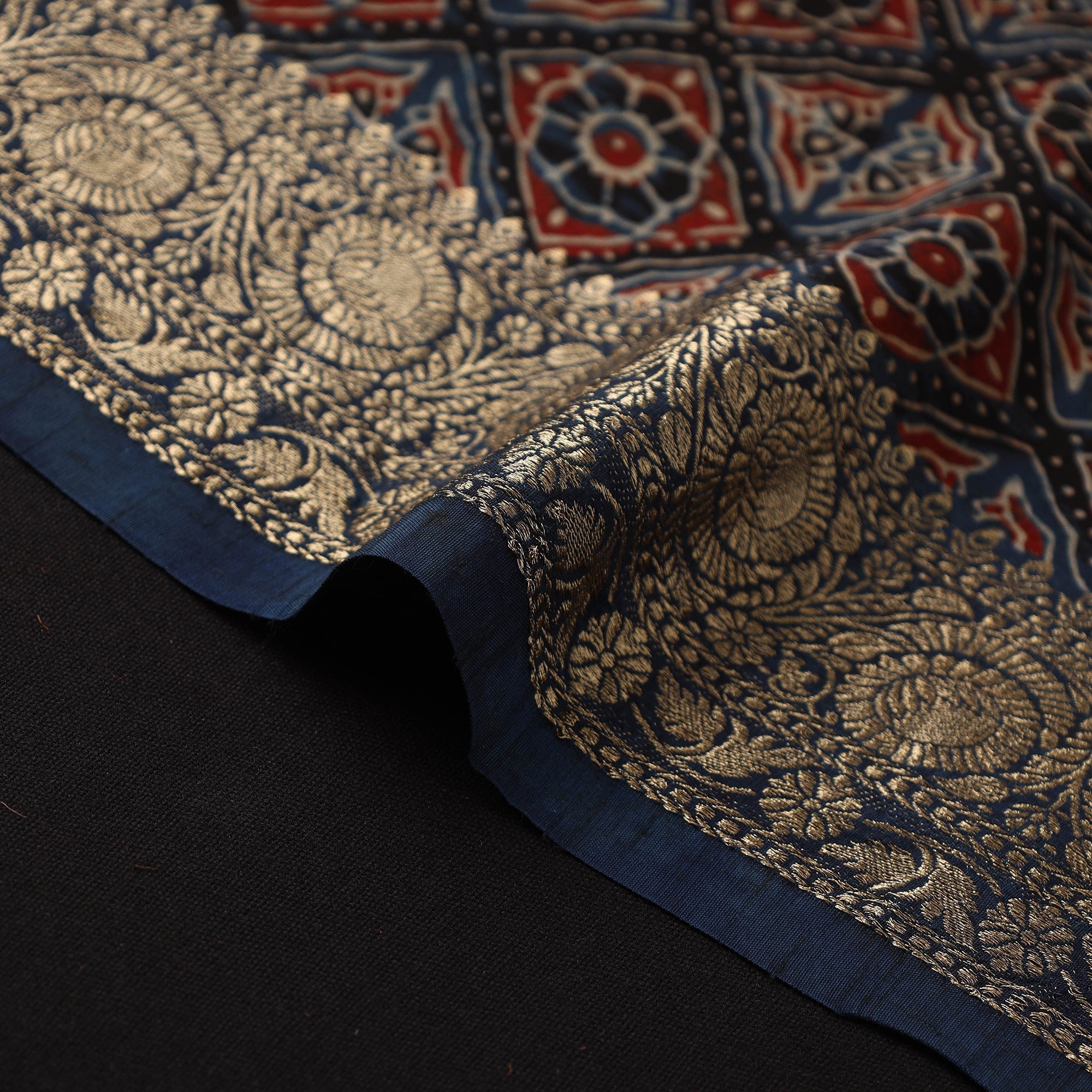 Blue ajrakh fabric is hand block printed using traditional techniques and natural dyes from Kutch, showcasing Gujarat’s textile heritage through detailed patterns and rich tones. Crafted on dola silk cotton, it offers a smooth drape and comfortable wear. The added zari border gives it an elegant finish, making it ideal for kurtas, shirts, dresses or stylish home decor pieces.