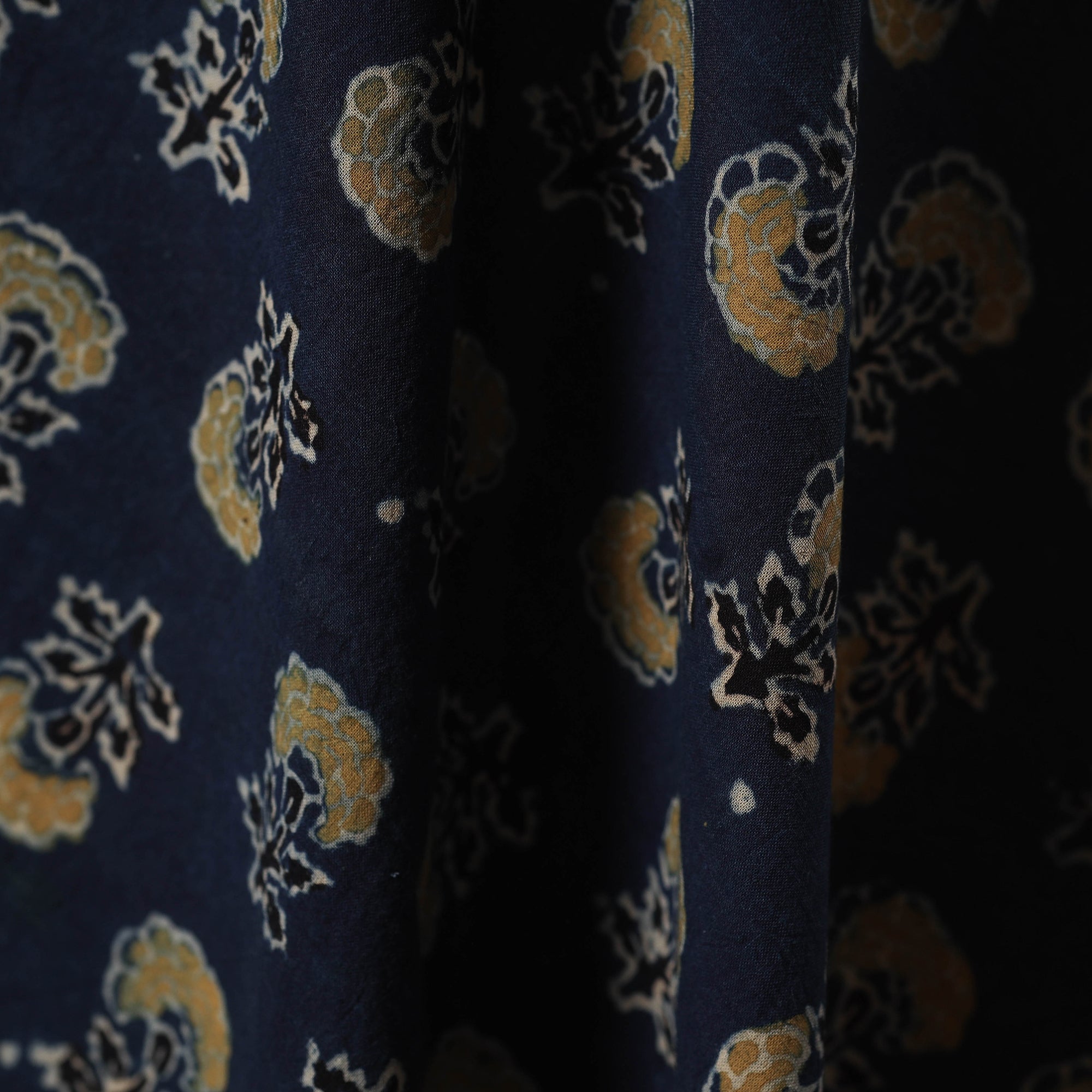Blue ajrakh fabric crafted using natural-dyeing and resist block-printing techniques. This ancient craft is estimated to be around 4,500 years old. The Ajrakh artisans in India originally migrated from Sindh to the Kutch region of Gujarat and to Barmer in Rajasthan. Ajrakh is also the traditional attire of the Maldhari pastoral community of Bhuj. The process is long and detailed, involving multiple stages where each layer of colour is printed only after a resting period, allowing the cloth to absorb the dye fully. Made of breathable cotton it is ideal for creating kurtas, shirts, dresses or even home decor items.