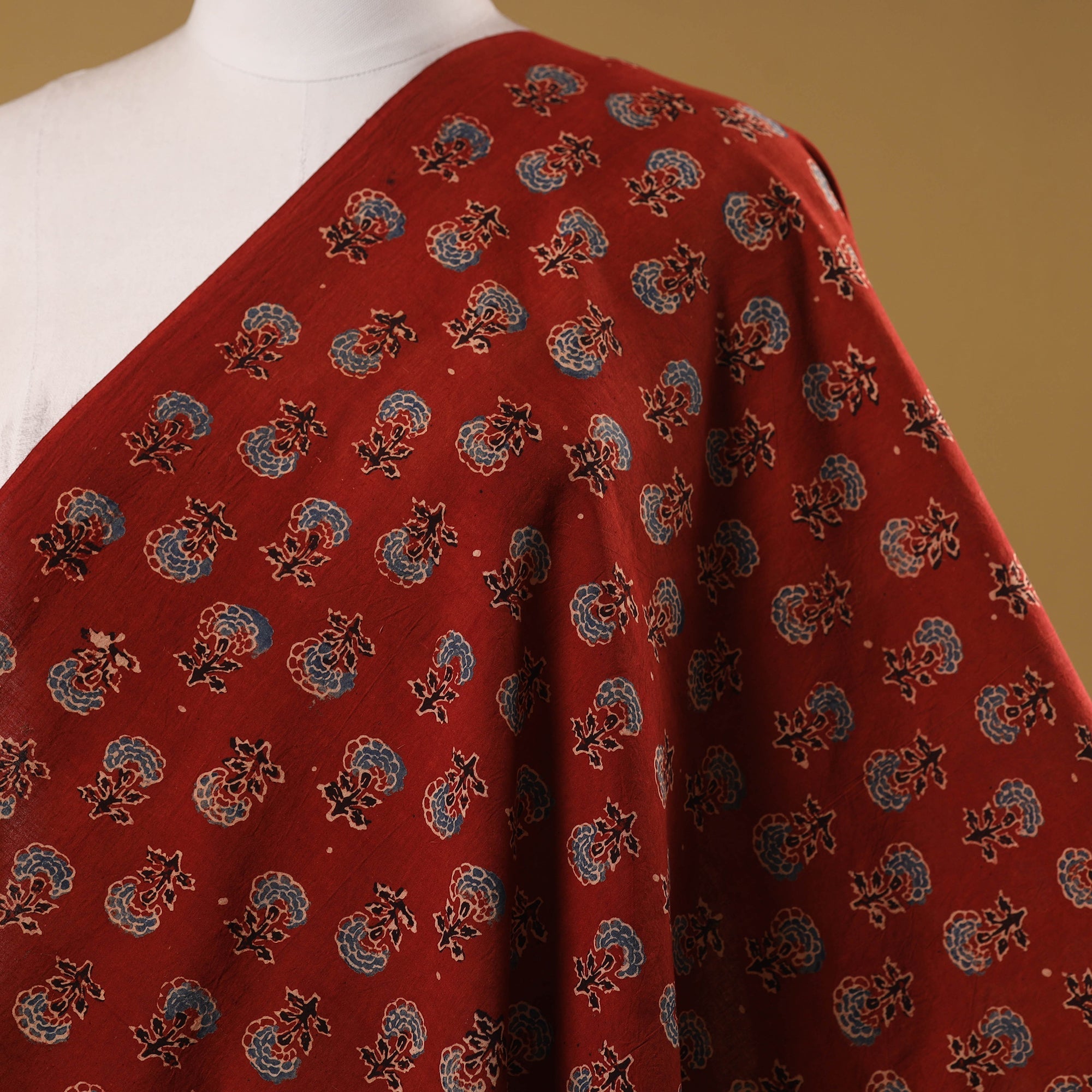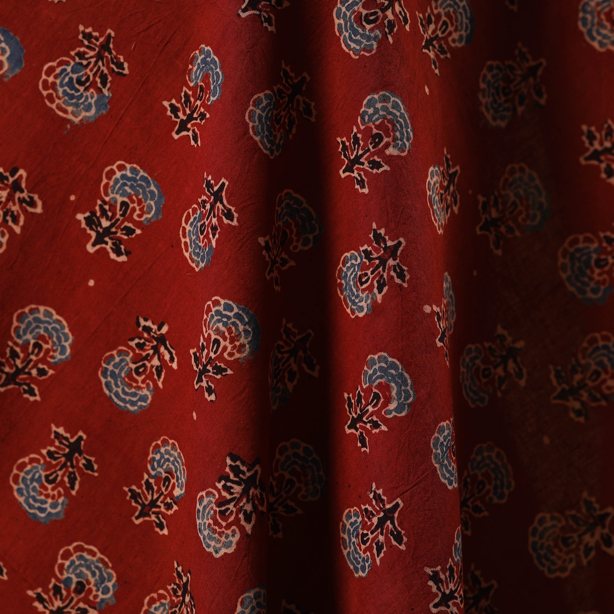 Red ajrakh fabric crafted using natural-dyeing and resist block-printing techniques. This ancient craft is estimated to be around 4,500 years old. The Ajrakh artisans in India originally migrated from Sindh to the Kutch region of Gujarat and to Barmer in Rajasthan. Ajrakh is also the traditional attire of the Maldhari pastoral community of Bhuj. The process is long and detailed, involving multiple stages where each layer of colour is printed only after a resting period, allowing the cloth to absorb the dye fully. Made of breathable cotton it is ideal for creating kurtas, shirts, dresses or even home decor items.