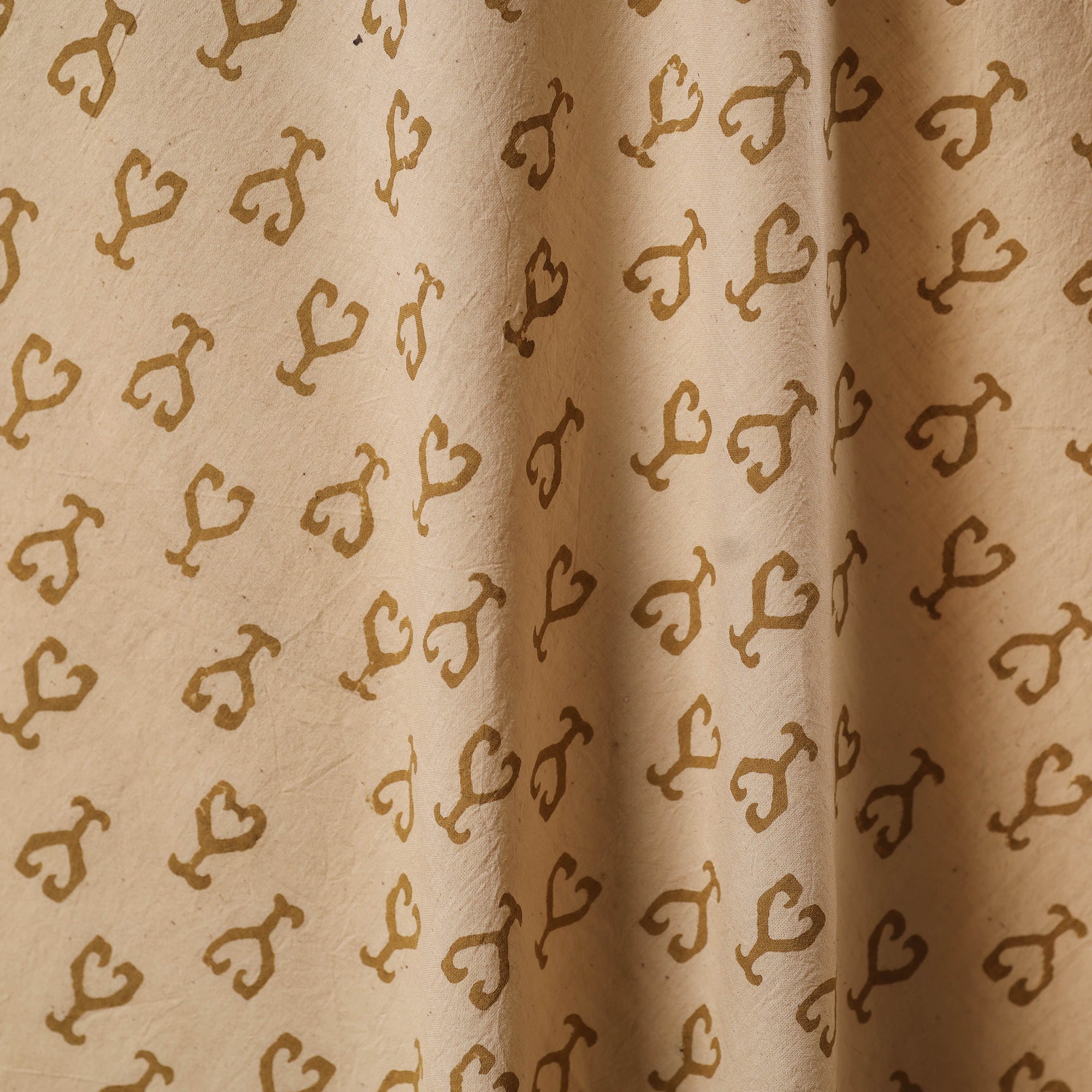 Beige ajrakh fabric crafted using natural-dyeing and resist block-printing techniques. This ancient craft is estimated to be around 4,500 years old. The Ajrakh artisans in India originally migrated from Sindh to the Kutch region of Gujarat and to Barmer in Rajasthan. Ajrakh is also the traditional attire of the Maldhari pastoral community of Bhuj. The process is long and detailed, involving multiple stages where each layer of colour is printed only after a resting period, allowing the cloth to absorb the dye fully. Made of breathable cotton it is ideal for creating kurtas, shirts, dresses or even home decor items.