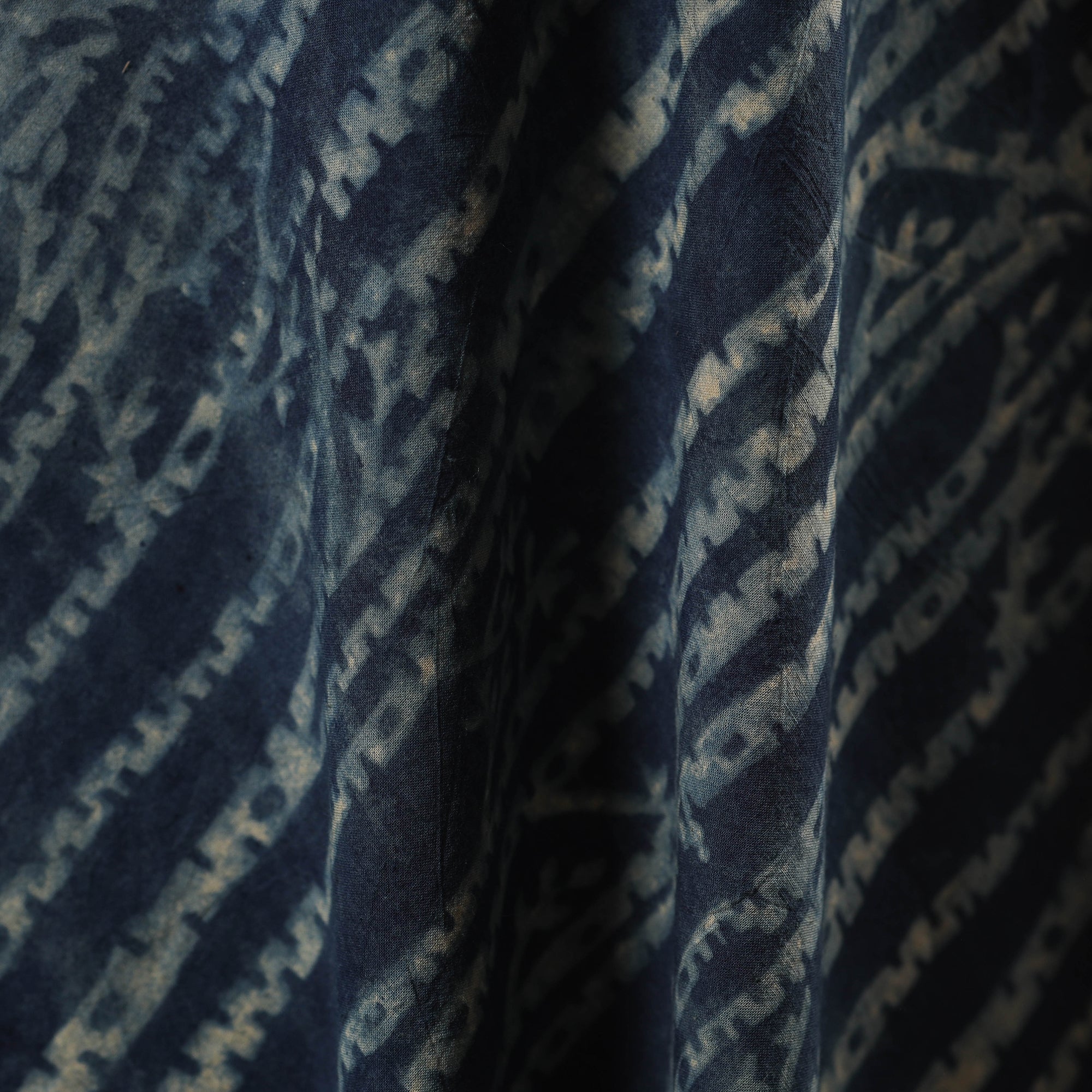 Blue ajrakh fabric crafted using natural-dyeing and resist block-printing techniques. This ancient craft is estimated to be around 4,500 years old. The Ajrakh artisans in India originally migrated from Sindh to the Kutch region of Gujarat and to Barmer in Rajasthan. Ajrakh is also the traditional attire of the Maldhari pastoral community of Bhuj. The process is long and detailed, involving multiple stages where each layer of colour is printed only after a resting period, allowing the cloth to absorb the dye fully. Made of breathable cotton it is ideal for creating kurtas, shirts, dresses or even home decor items.