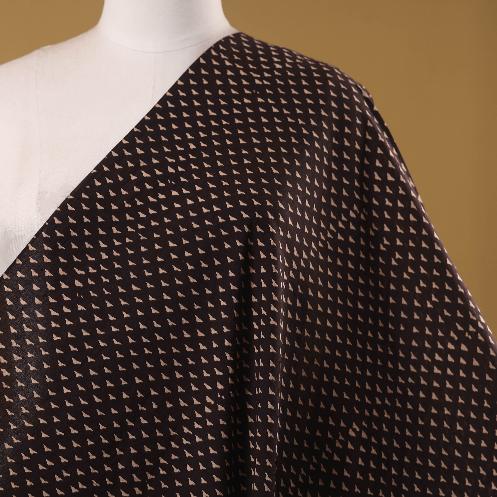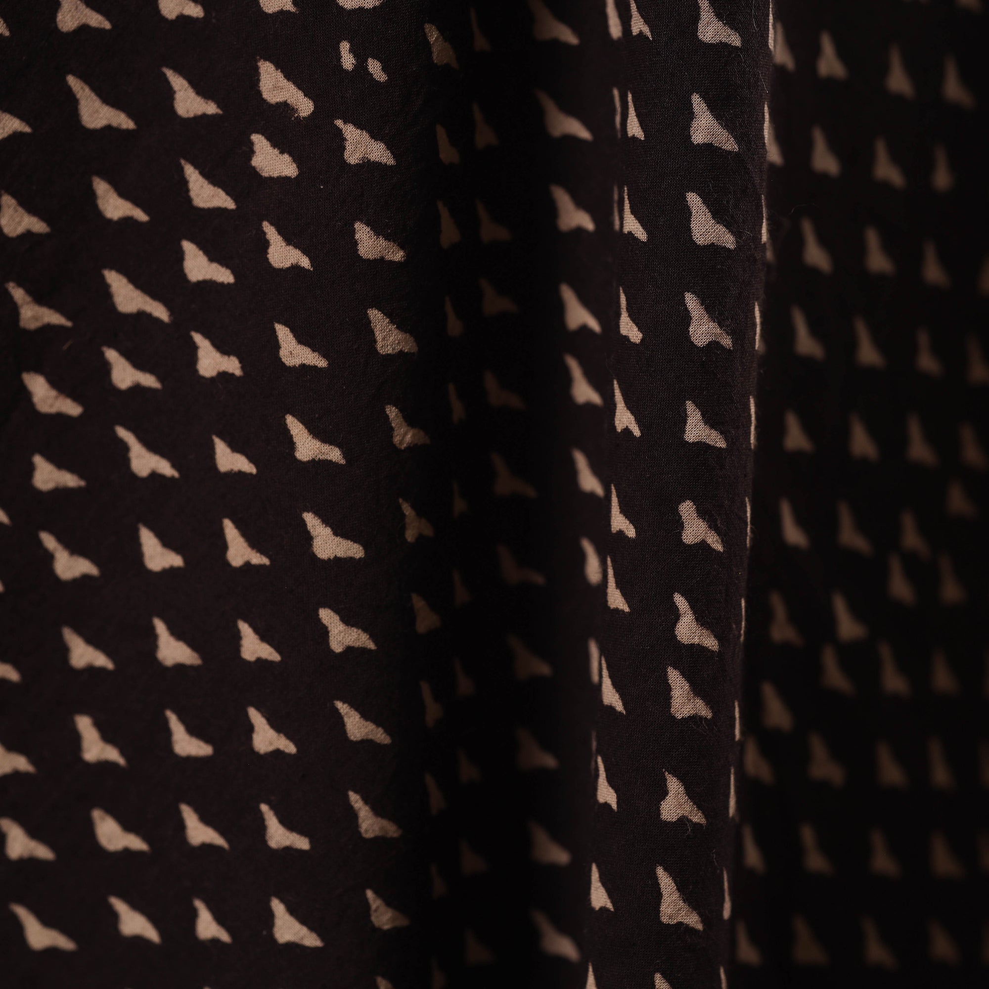 Black ajrakh fabric crafted using natural-dyeing and resist block-printing techniques. This ancient craft is estimated to be around 4,500 years old. The Ajrakh artisans in India originally migrated from Sindh to the Kutch region of Gujarat and to Barmer in Rajasthan. Ajrakh is also the traditional attire of the Maldhari pastoral community of Bhuj. The process is long and detailed, involving multiple stages where each layer of colour is printed only after a resting period, allowing the cloth to absorb the dye fully. Made of breathable cotton it is ideal for creating kurtas, shirts, dresses or even home decor items.
