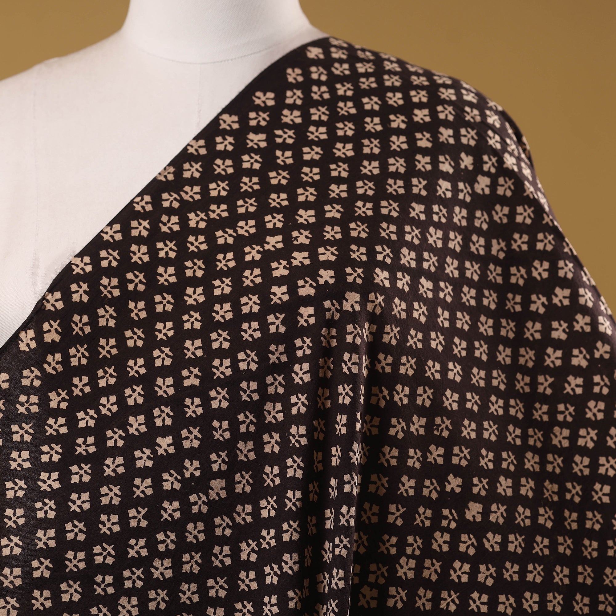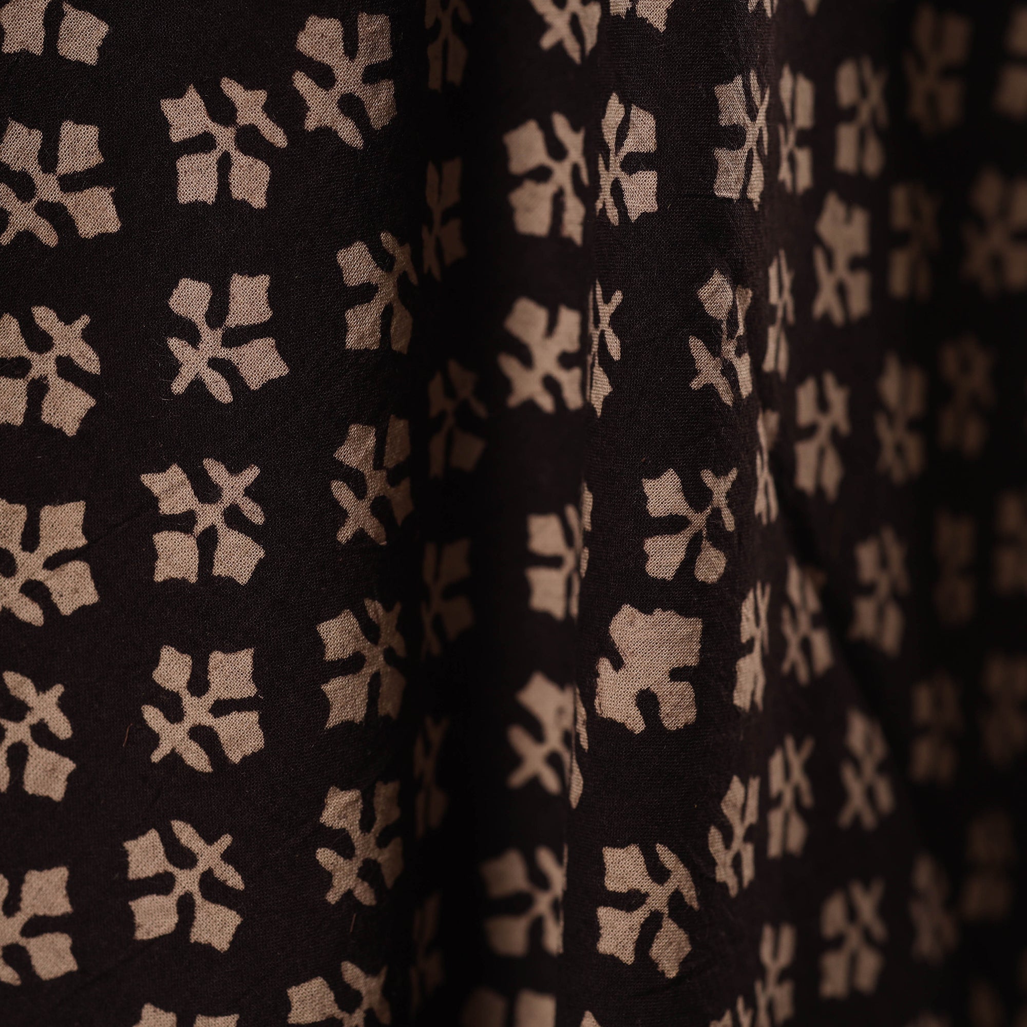 Black ajrakh fabric crafted using natural-dyeing and resist block-printing techniques. This ancient craft is estimated to be around 4,500 years old. The Ajrakh artisans in India originally migrated from Sindh to the Kutch region of Gujarat and to Barmer in Rajasthan. Ajrakh is also the traditional attire of the Maldhari pastoral community of Bhuj. The process is long and detailed, involving multiple stages where each layer of colour is printed only after a resting period, allowing the cloth to absorb the dye fully. Made of breathable cotton it is ideal for creating kurtas, shirts, dresses or even home decor items.