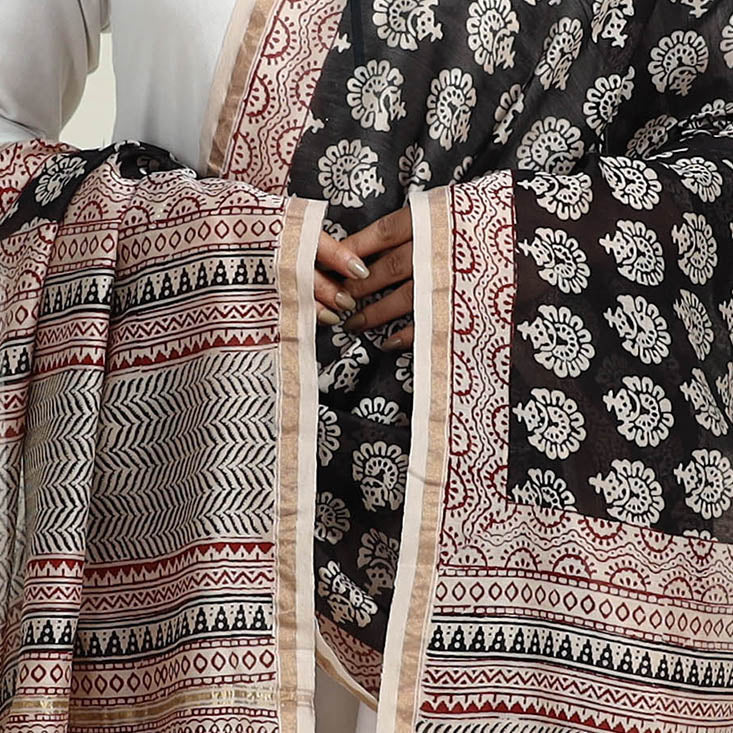 Experience the beauty of traditional black bagh block printing with this natural dyed hand block print chanderi silk-cotton bagh handloom dupatta. Handcrafted by master artisan Mohammed Rafik Ji Khatri, this dupatta showcases intricate floral patterns, reflecting the cultural heritage of Bagh, Madhya Pradesh. Each piece is crafted with care, using eco-friendly dyes to ensure durability and comfort. Perfect for festive occasions or casual wear.