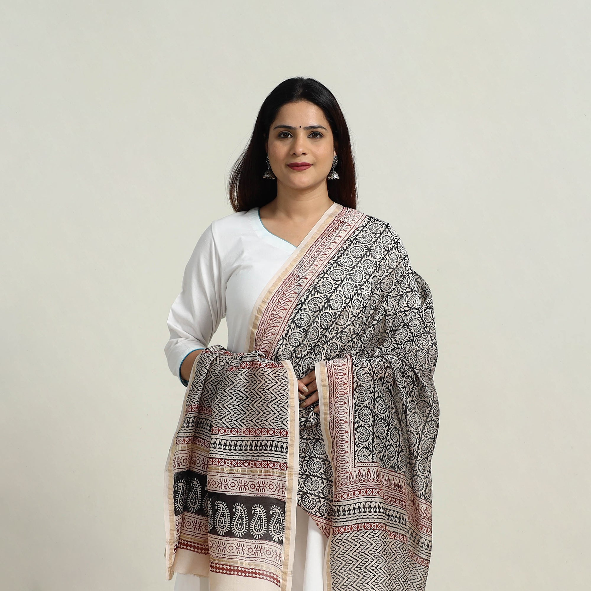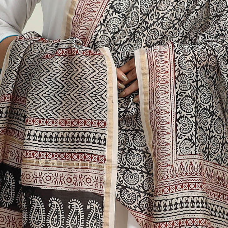 Experience the beauty of traditional grey bagh block printing with this natural dyed hand block print chanderi silk-cotton bagh handloom dupatta. Handcrafted by master artisan Mohammed Rafik Ji Khatri, this dupatta showcases intricate floral patterns, reflecting the cultural heritage of Bagh, Madhya Pradesh. Each piece is crafted with care, using eco-friendly dyes to ensure durability and comfort. Perfect for festive occasions or casual wear.
