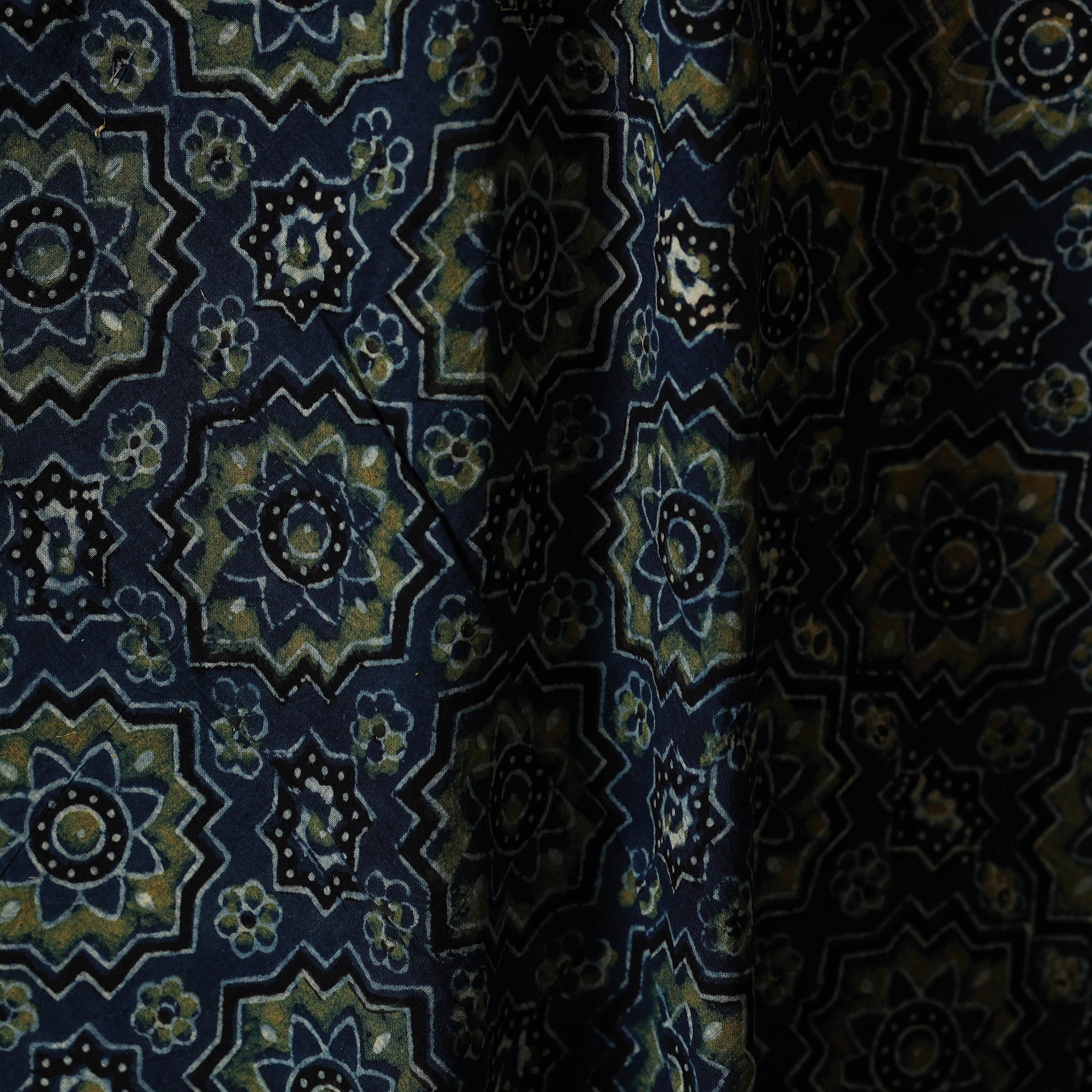This blue ajrakh cotton fabric from Kutch, Gujarat, is block printed by artisan A. Jabbar Haji Zakariya Khatri using traditional techniques and natural dyes. Renowned for its rich hues and intricate patterns, it beautifully blends heritage with modern appeal. Crafted on breathable cotton, it’s perfect for creating kurtas, dresses, shirts, or home decor pieces.