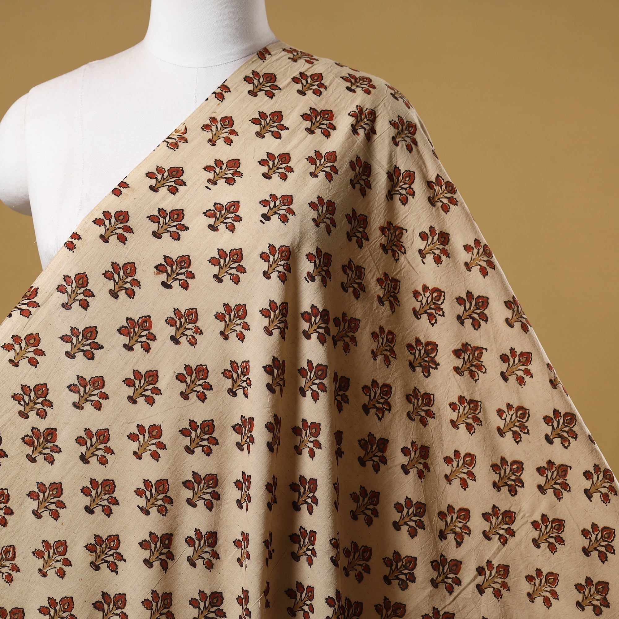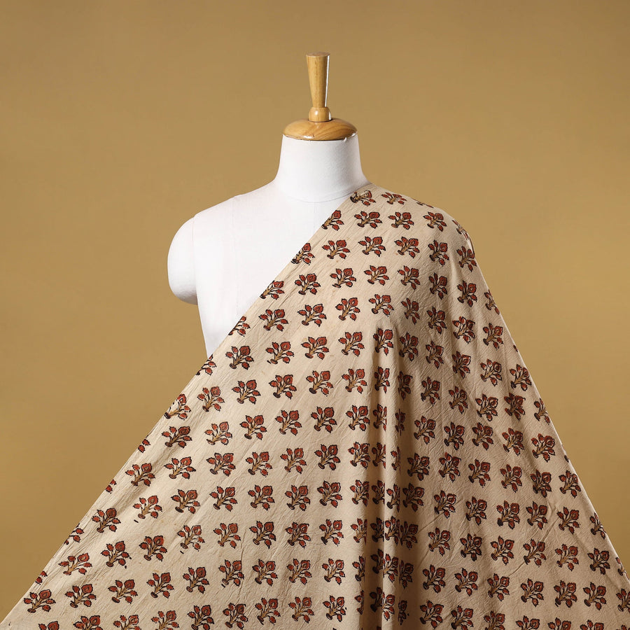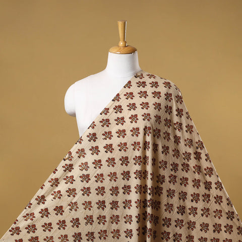 Beige ajrakh fabric crafted using natural-dyeing and resist block-printing techniques. This ancient craft is estimated to be around 4,500 years old. The Ajrakh artisans in India originally migrated from Sindh to the Kutch region of Gujarat and to Barmer in Rajasthan. Ajrakh is also the traditional attire of the Maldhari pastoral community of Bhuj. The process is long and detailed, involving multiple stages where each layer of colour is printed only after a resting period, allowing the cloth to absorb the dye fully. Made of breathable cotton, it is ideal for creating kurtas, shirts, dresses or even home decor items.