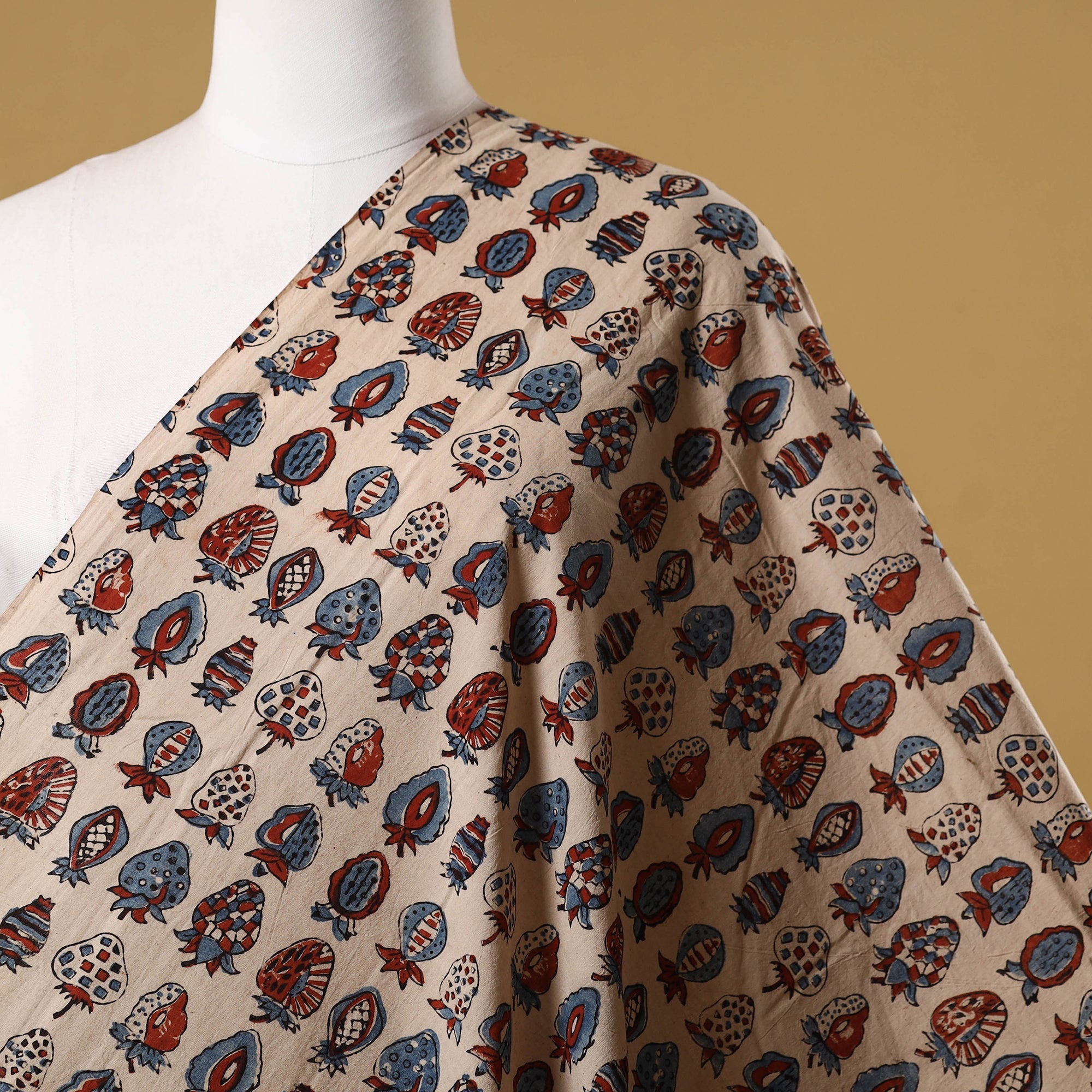 Beige ajrakh fabric crafted using natural-dyeing and resist block-printing techniques. This ancient craft is estimated to be around 4,500 years old. The Ajrakh artisans in India originally migrated from Sindh to the Kutch region of Gujarat and to Barmer in Rajasthan. Ajrakh is also the traditional attire of the Maldhari pastoral community of Bhuj. The process is long and detailed, involving multiple stages where each layer of colour is printed only after a resting period, allowing the cloth to absorb the dye fully. Made of breathable cotton, it is ideal for creating kurtas, shirts, dresses or even home decor items.