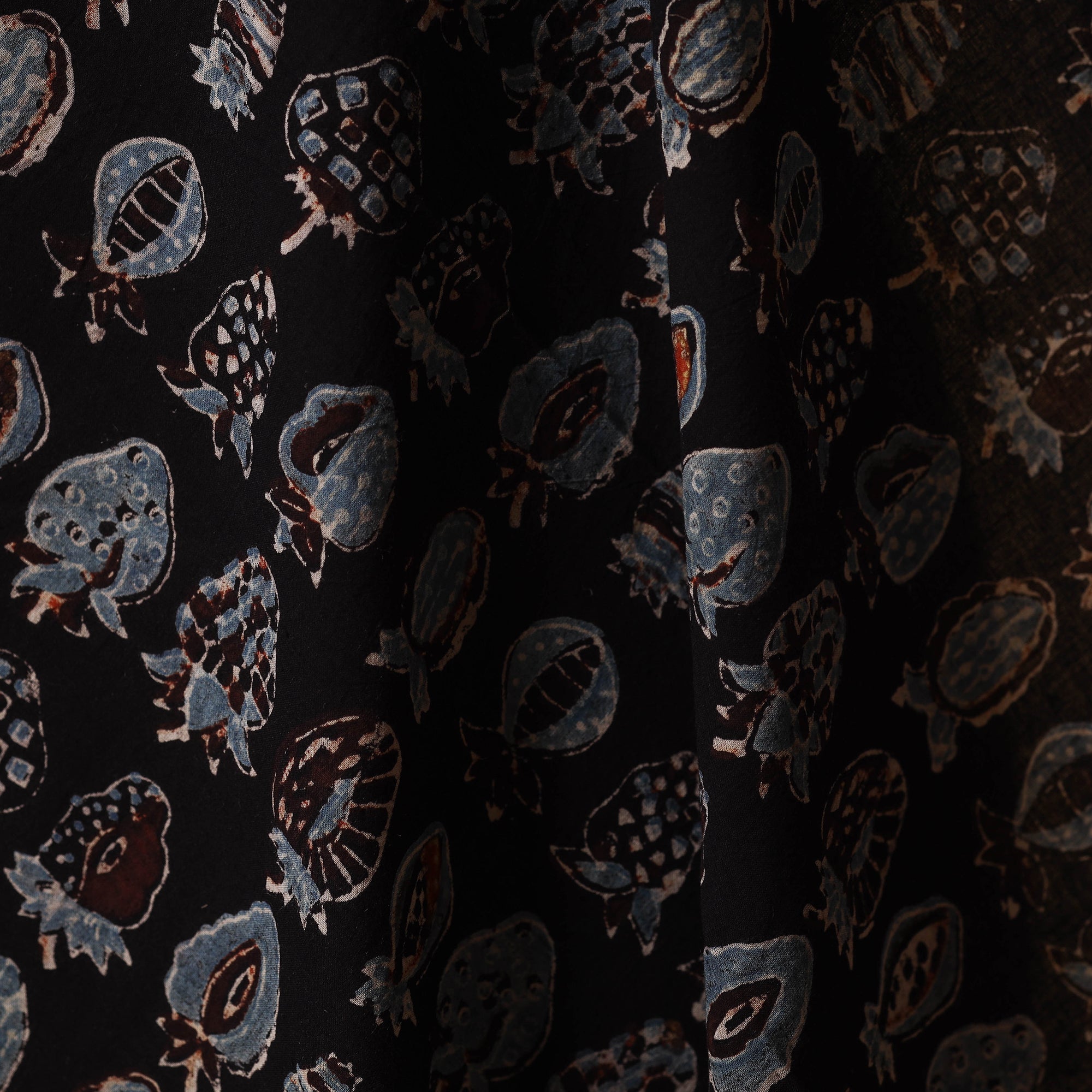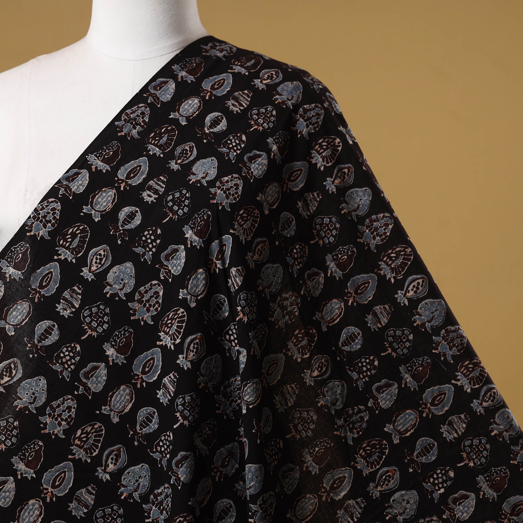 Black ajrakh fabric crafted using natural-dyeing and resist block-printing techniques. This ancient craft is estimated to be around 4,500 years old. The Ajrakh artisans in India originally migrated from Sindh to the Kutch region of Gujarat and to Barmer in Rajasthan. Ajrakh is also the traditional attire of the Maldhari pastoral community of Bhuj. The process is long and detailed, involving multiple stages where each layer of colour is printed only after a resting period, allowing the cloth to absorb the dye fully. Made of breathable cotton, it is ideal for creating kurtas, shirts, dresses or even home decor items.