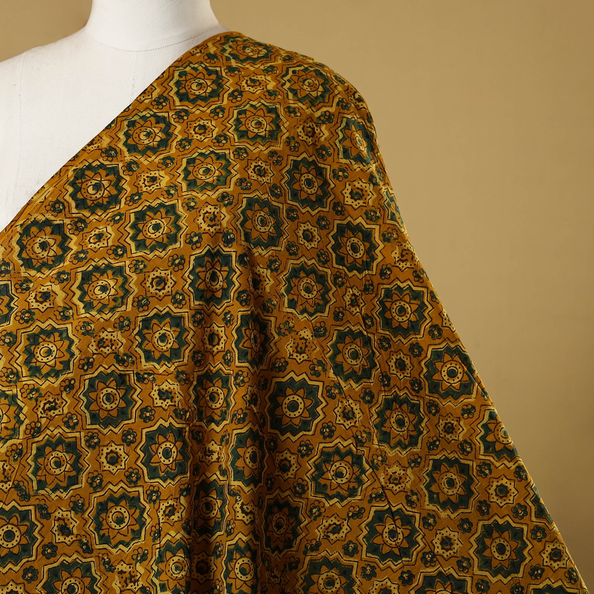 This yellow ajrakh cotton fabric from Kutch, Gujarat, is block printed by artisan A. Jabbar Haji Zakariya Khatri using traditional techniques and natural dyes. Renowned for its rich hues and intricate patterns, it beautifully blends heritage with modern appeal. Crafted on breathable cotton, it’s perfect for creating kurtas, dresses, shirts, or home decor pieces.
