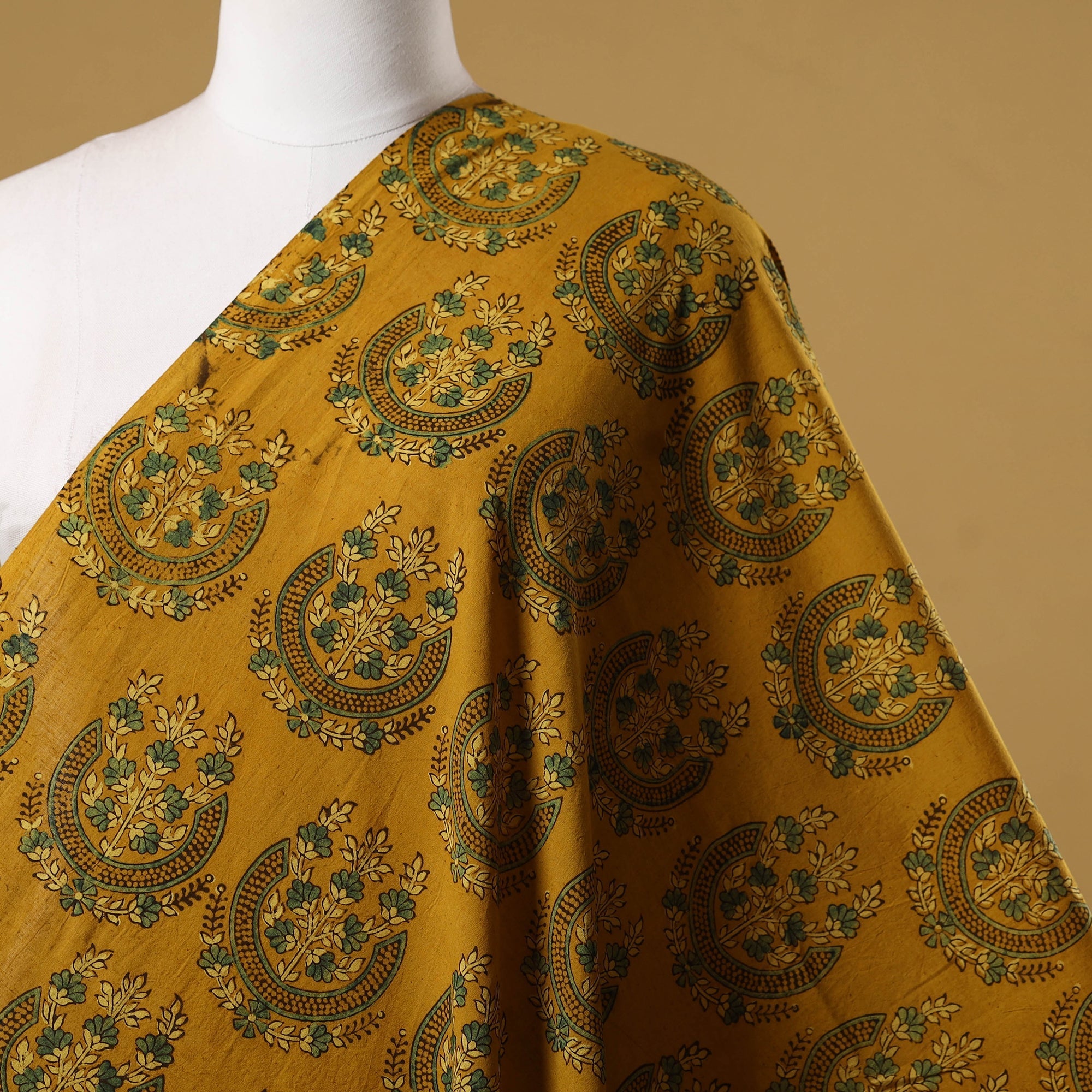 Yellow ajrakh fabric crafted using natural-dyeing and resist block-printing techniques. This ancient craft is estimated to be around 4,500 years old. The Ajrakh artisans in India originally migrated from Sindh to the Kutch region of Gujarat and to Barmer in Rajasthan. Ajrakh is also the traditional attire of the Maldhari pastoral community of Bhuj. The process is long and detailed, involving multiple stages where each layer of colour is printed only after a resting period, allowing the cloth to absorb the dye fully. Made of breathable cotton, it is ideal for creating kurtas, shirts, dresses or even home decor items.