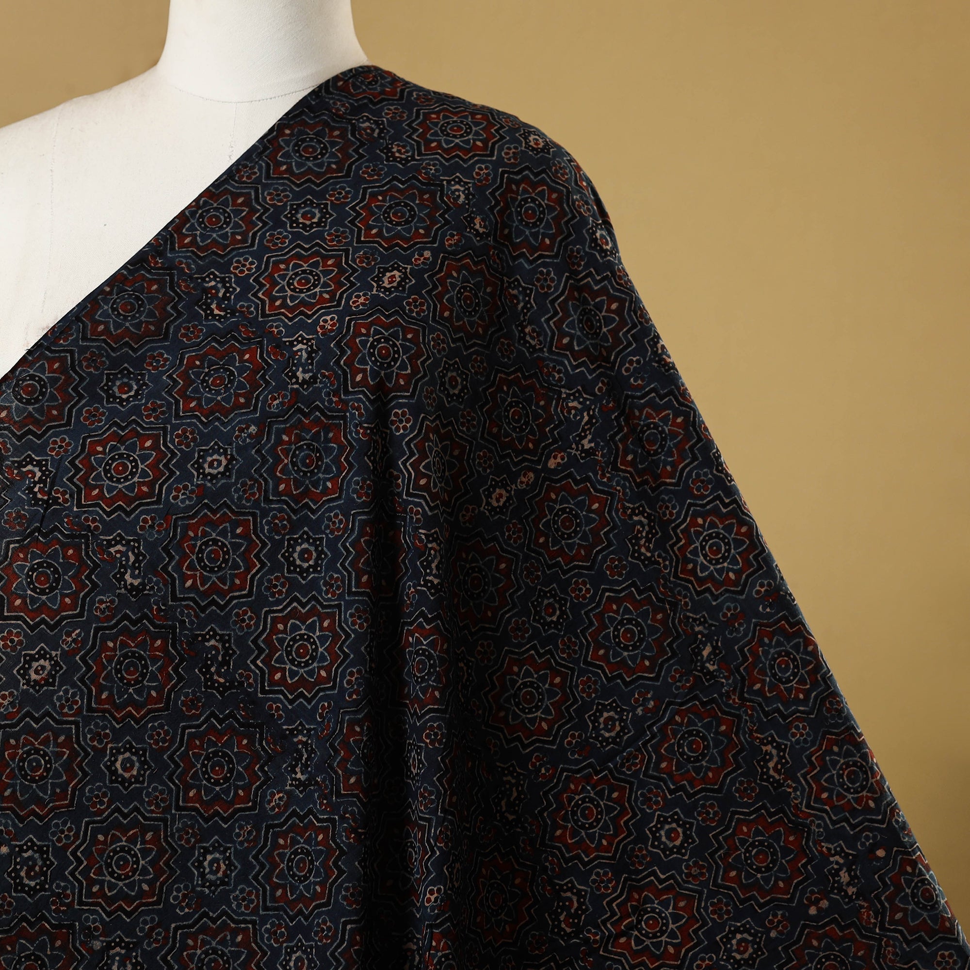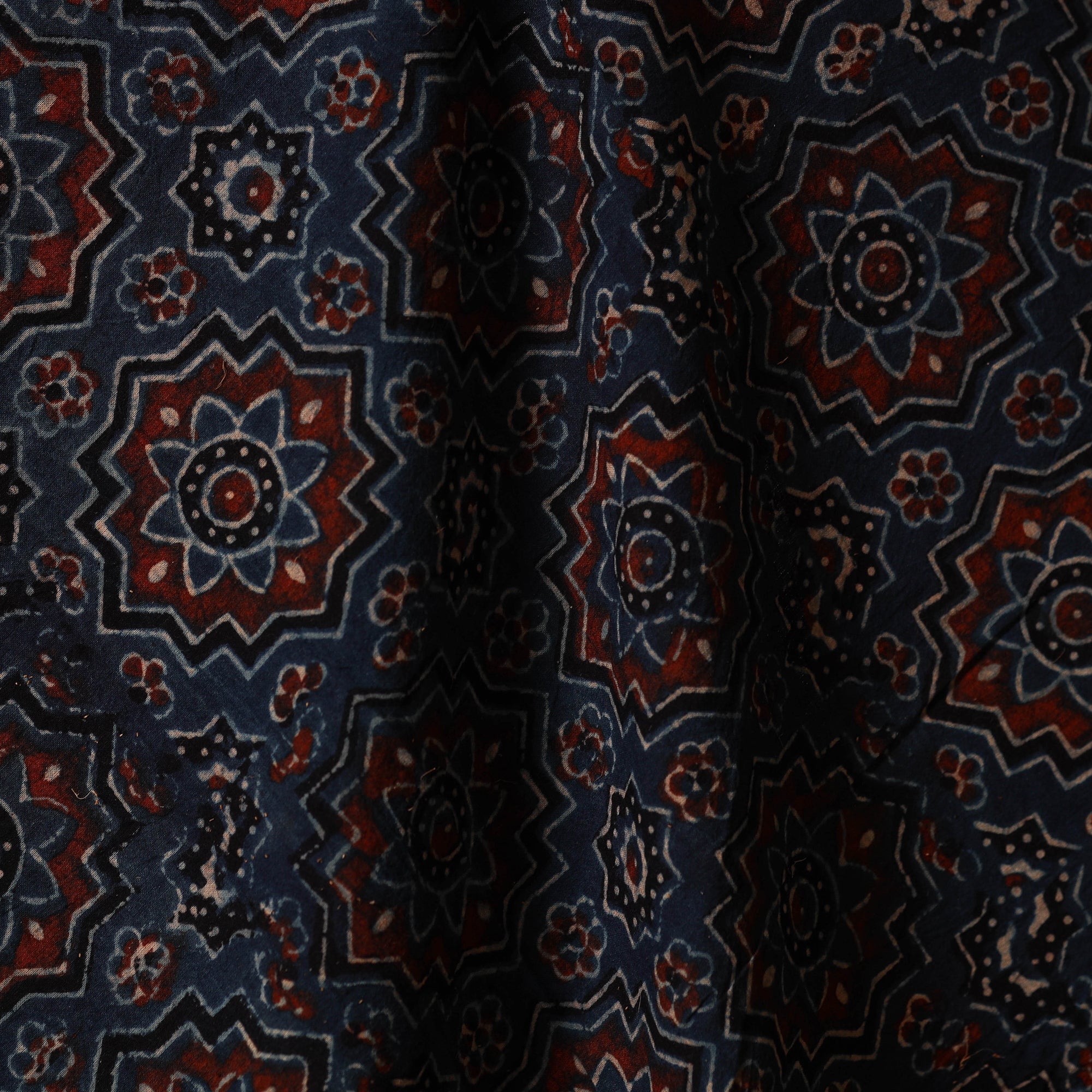 This blue ajrakh cotton fabric from Kutch, Gujarat, is block printed by artisan A. Jabbar Haji Zakariya Khatri using traditional techniques and natural dyes. Renowned for its rich hues and intricate patterns, it beautifully blends heritage with modern appeal. Crafted on breathable cotton, it’s perfect for creating kurtas, dresses, shirts, or home decor pieces.
