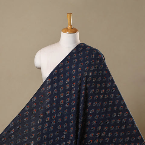 Ajrakh fabric by Tausif Khatri crafted using natural dyeing and resist block-printing techniques. This ancient craft is estimated to be around 4,500 years old. The Ajrakh artisans in India originally migrated from Sindh to the Kutch region of Gujarat and to Barmer in Rajasthan. Ajrakh is also the traditional attire of the Maldhari pastoral community of Bhuj. The process is long and detailed, involving multiple stages where each layer of colour is printed only after a resting period, allowing the cloth to absorb the dye fully. Made of breathable cotton it is ideal for creating kurtas, shirts, dresses or even home decor items.
