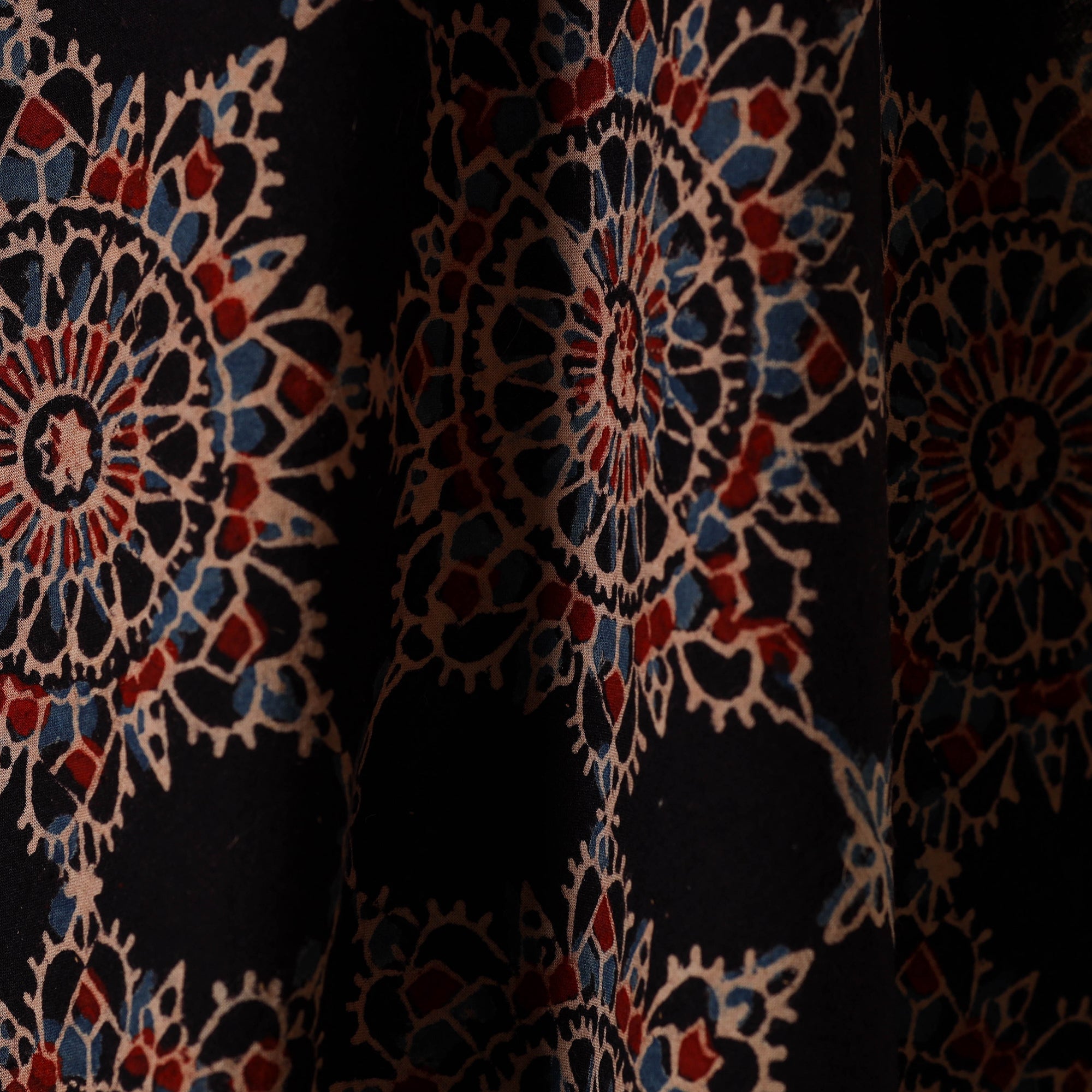Black ajrakh fabric is hand block-printed in Kutch using natural dyes and age-old techniques passed down through generations. Crafted with precision, each motif reflects Gujarat’s rich textile heritage. Made of breathable cotton, it's ideal for creating kurtas, shirts, dresses, or even elegant home decor accents.