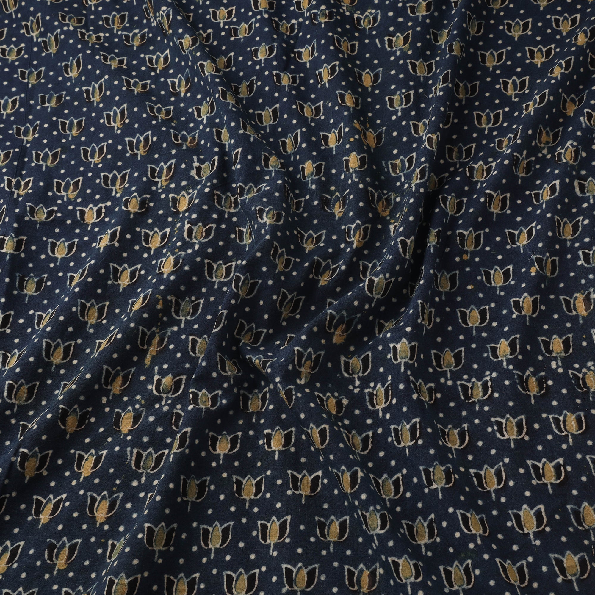 Blue ajrakh fabric by Tausif Khatri crafted using natural dyeing and resist block-printing techniques. This ancient craft is estimated to be around 4,500 years old. The Ajrakh artisans in India originally migrated from Sindh to the Kutch region of Gujarat and to Barmer in Rajasthan. Ajrakh is also the traditional attire of the Maldhari pastoral community of Bhuj. The process is long and detailed, involving multiple stages where each layer of colour is printed only after a resting period, allowing the cloth to absorb the dye fully. Made of breathable cotton it is ideal for creating kurtas, shirts, dresses or even home decor items.