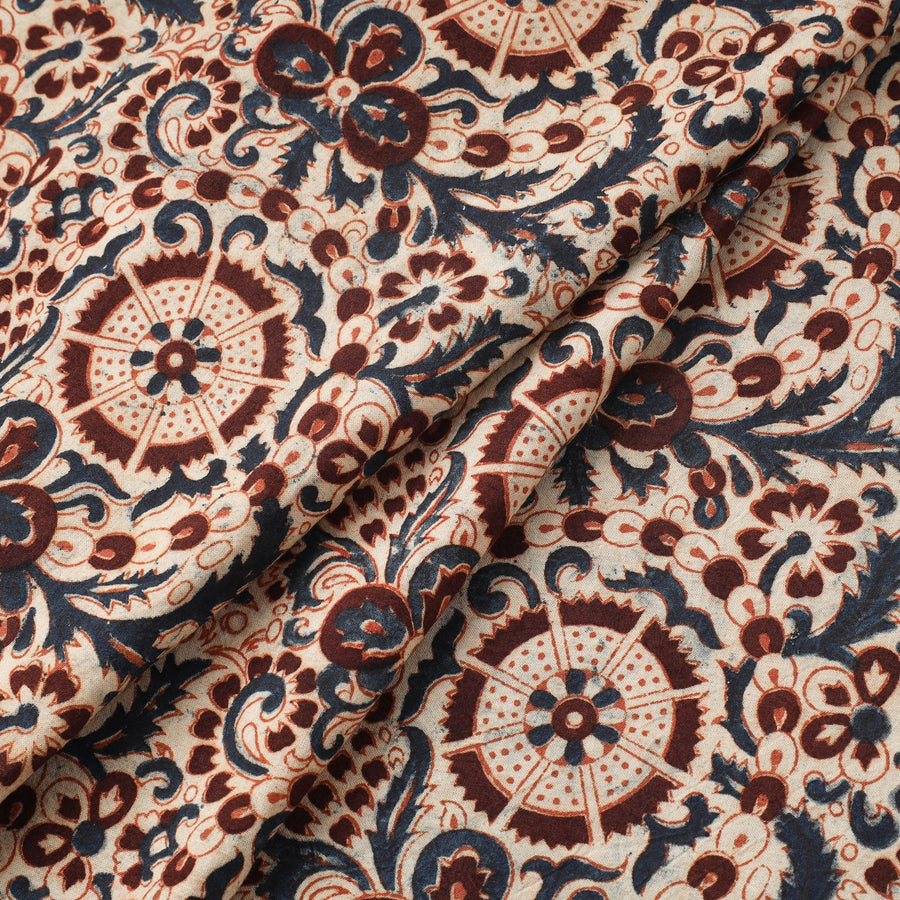 Brown kalamkari hand block printed pure cotton fabric from Pedana, Andhra Pradesh, is created using one of the earliest and most intricate printing techniques. Pitchuka Srinivas Skilled artisans use hand-carved wooden blocks dipped in natural dyes to form traditonal kalamkari motifs. This fabric is suitable for stitching garments, dupattas or home decor accents
