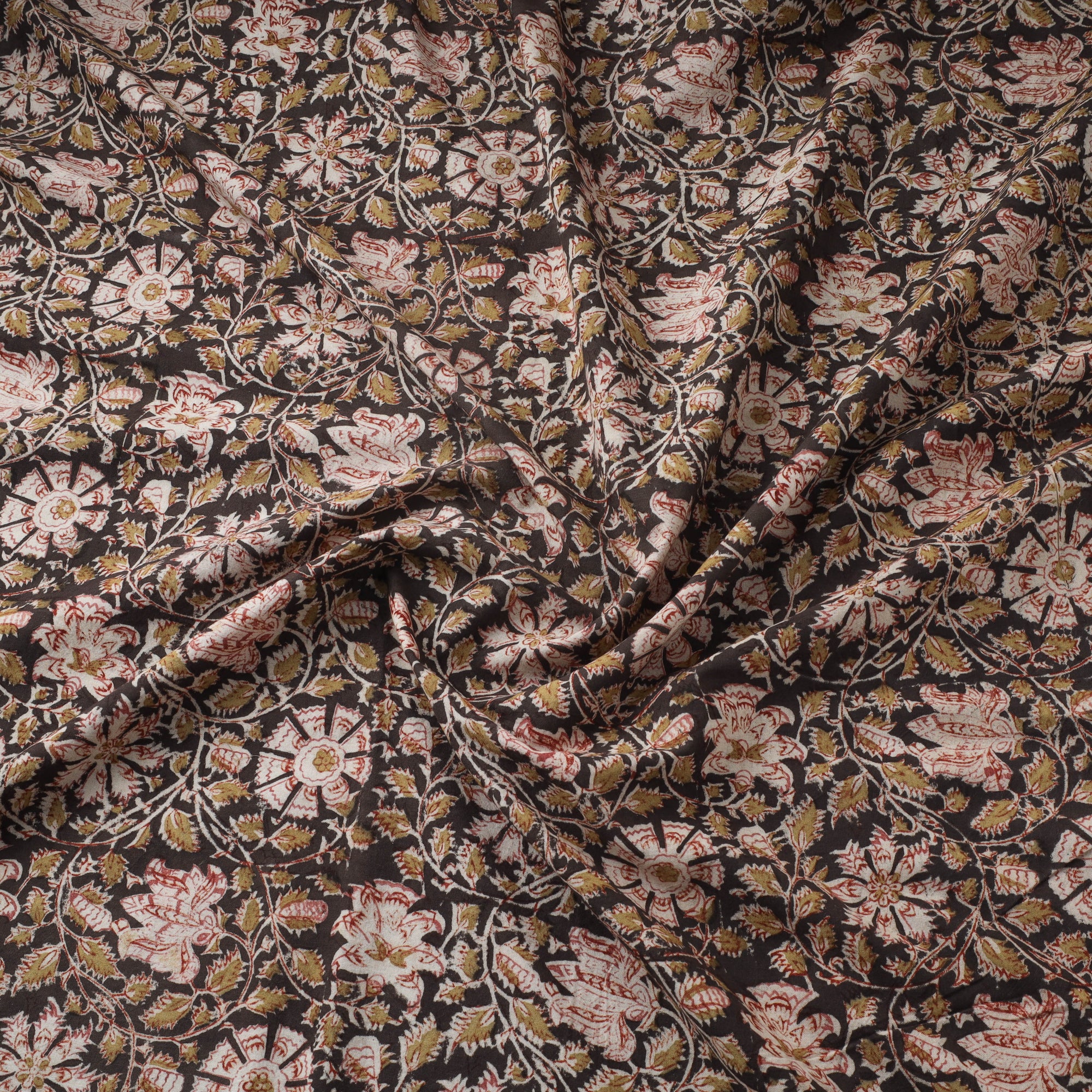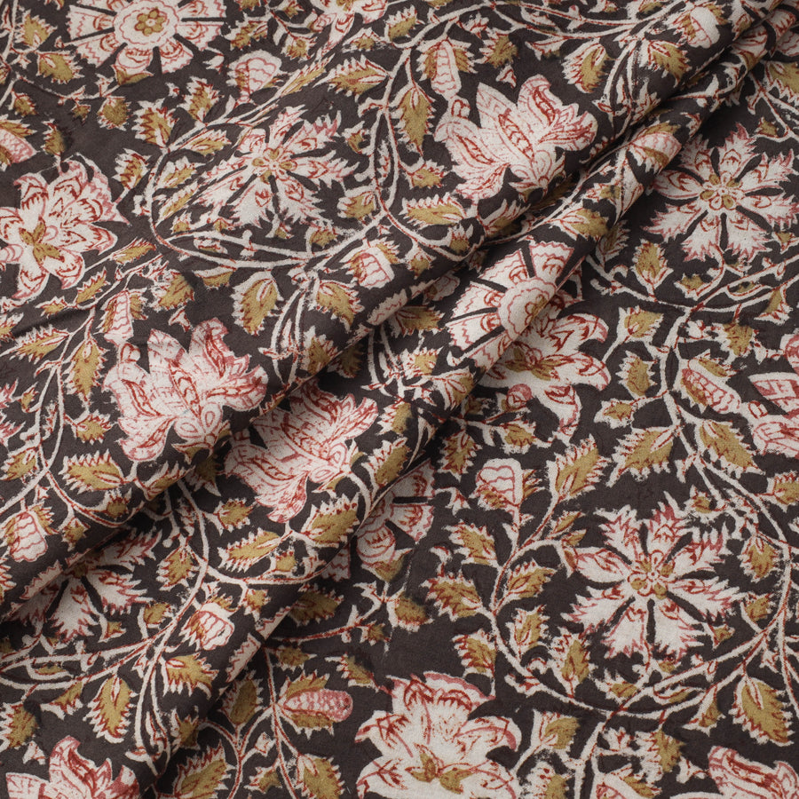 Black kalamkari hand block printed pure cotton fabric from Pedana, Andhra Pradesh, is created using one of the earliest and most intricate printing techniques. Pitchuka Srinivas Skilled artisans use hand-carved wooden blocks dipped in natural dyes to form traditonal kalamkari motifs. This fabric is suitable for stitching garments, dupattas or home decor accents