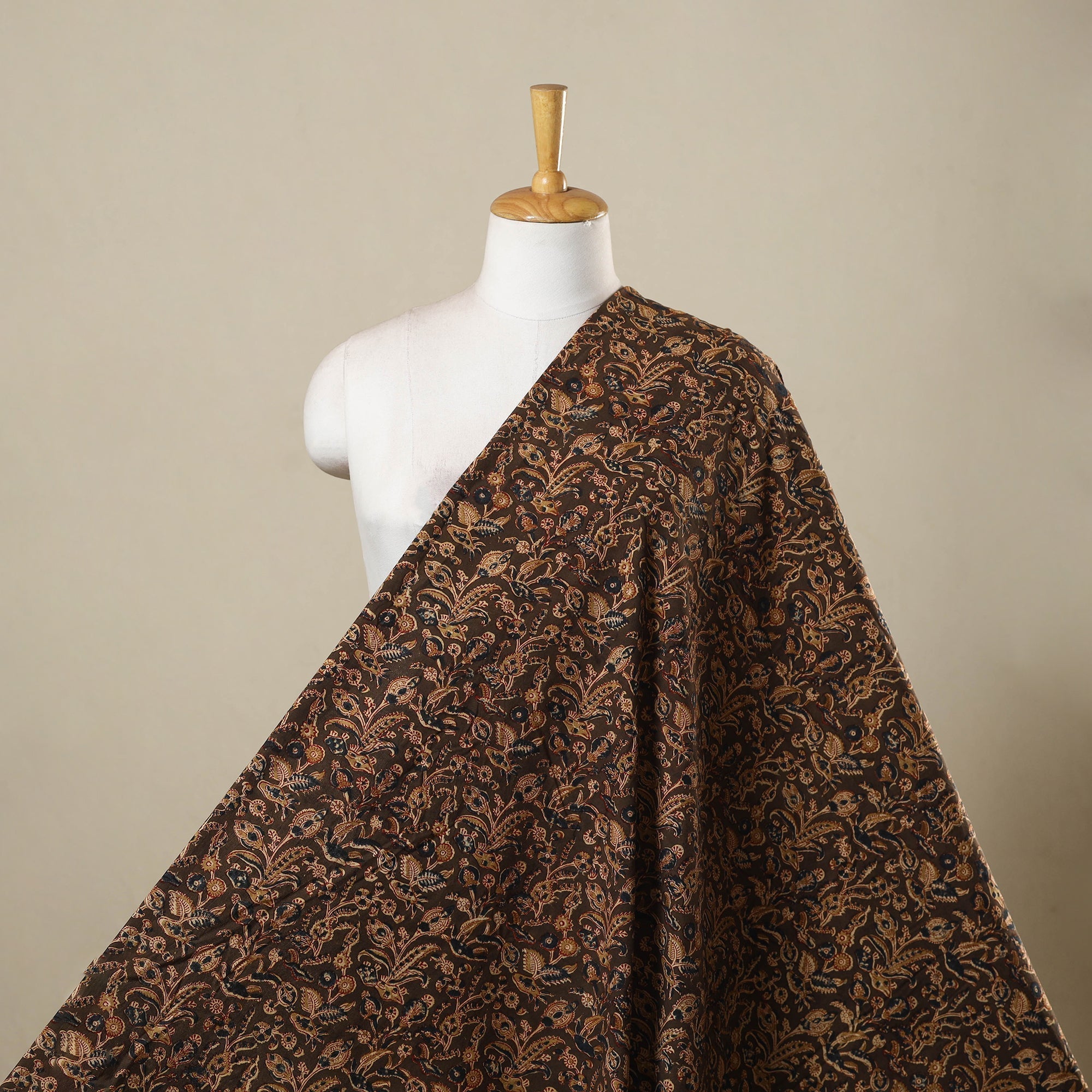Brown kalamkari hand block printed pure cotton fabric from Pedana, Andhra Pradesh, is created using one of the earliest and most intricate printing techniques. Pitchuka Srinivas Skilled artisans use hand-carved wooden blocks dipped in natural dyes to form traditonal kalamkari motifs. This fabric is suitable for stitching garments, dupattas or home decor accents