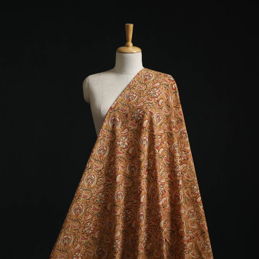 Orange kalamkari hand block printed pure cotton fabric from Pedana, Andhra Pradesh, is created using one of the earliest and most intricate printing techniques. Pitchuka Srinivas skilled artisans use hand-carved wooden blocks dipped in natural dyes to form traditonal kalamkari motifs. This fabric is suitable for stitching garments, dupattas or home decor accents Pitchuka Srinivas is a master artisan from Andhra Pradesh who has dedicated his life to preserving traditional hand-block printed pedana kalamkari, keeping this centuries-old craft alive with natural dyes and original techniques.