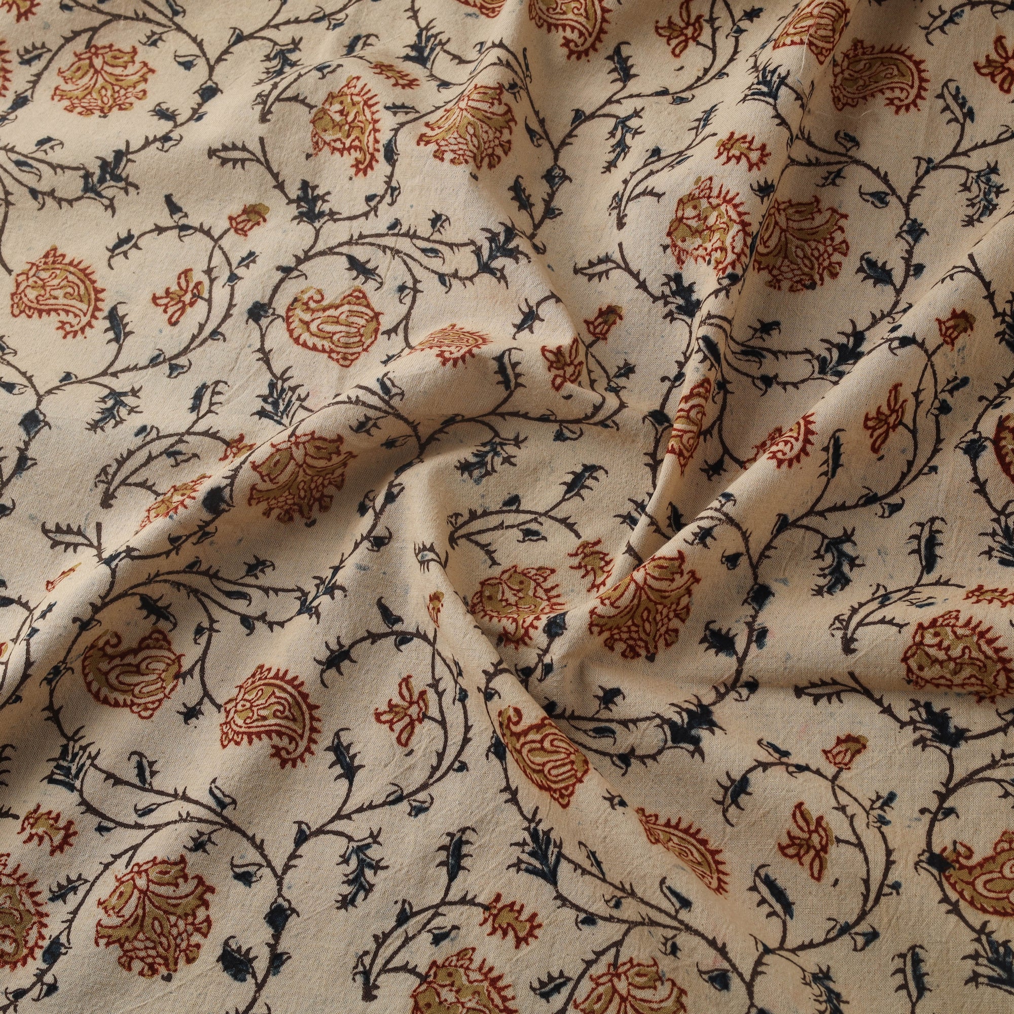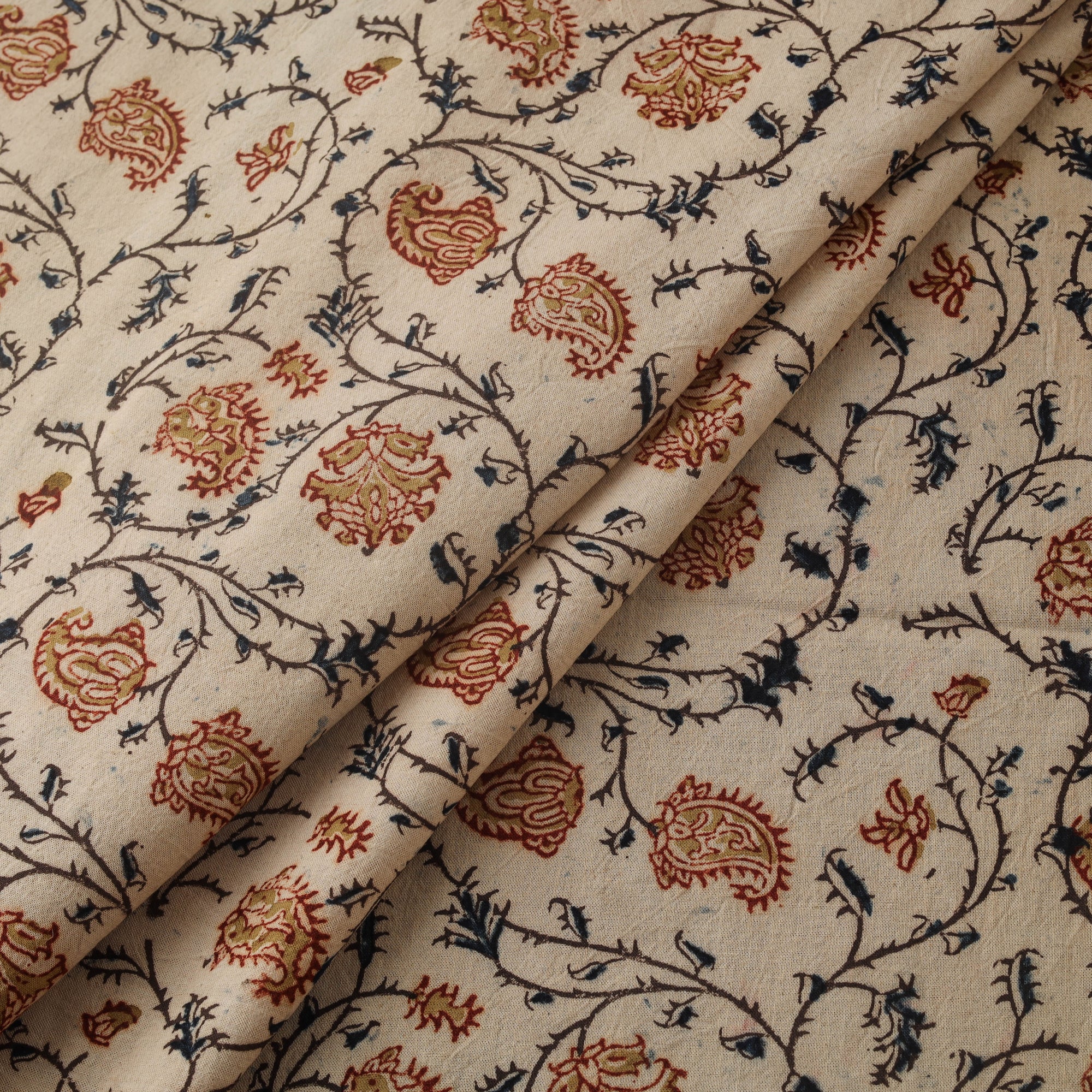 Beige kalamkari hand block printed pure cotton fabric from Pedana, Andhra Pradesh, is created using one of the earliest and most intricate printing techniques. Pitchuka Srinivas Skilled artisans use hand-carved wooden blocks dipped in natural dyes to form traditonal kalamkari motifs. This fabric is suitable for stitching garments, dupattas or home decor accents Pitchuka Srinivas is a master artisan from Andhra Pradesh who has dedicated his life to preserving traditional hand-block printed pedana kalamkari, keeping this centuries-old craft alive with natural dyes and original techniques.