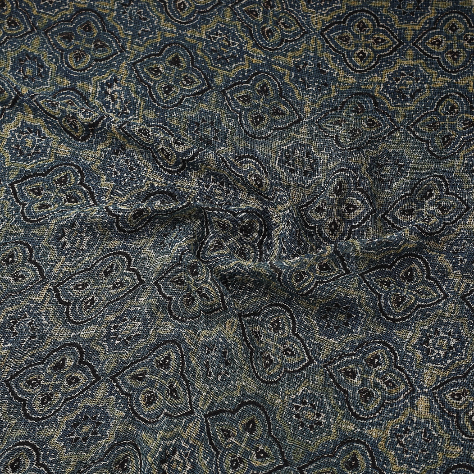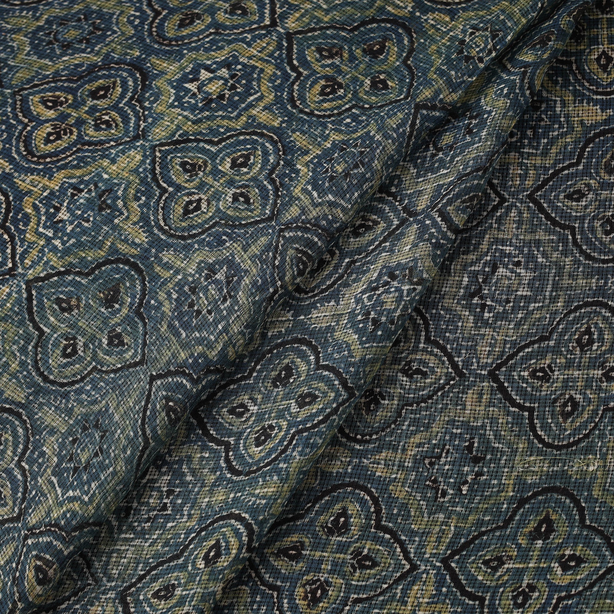 Blue ajrakh hand block print natural dye fabric by Tausif Khatri from Kutch. This ancient craft is estimated to be around 4,500 years old. The Ajrakh artisans in India originally migrated from Sindh to the Kutch region of Gujarat and to Barmer in Rajasthan. Ajrakh is also the traditional attire of the Maldhari pastoral community of Bhuj. The process is long and detailed, involving multiple stages where each layer of colour is printed only after a resting period, allowing the cloth to absorb the dye fully. Made of breathable kota doria cotton it is ideal for creating kurtas, dresses or even home decor items.