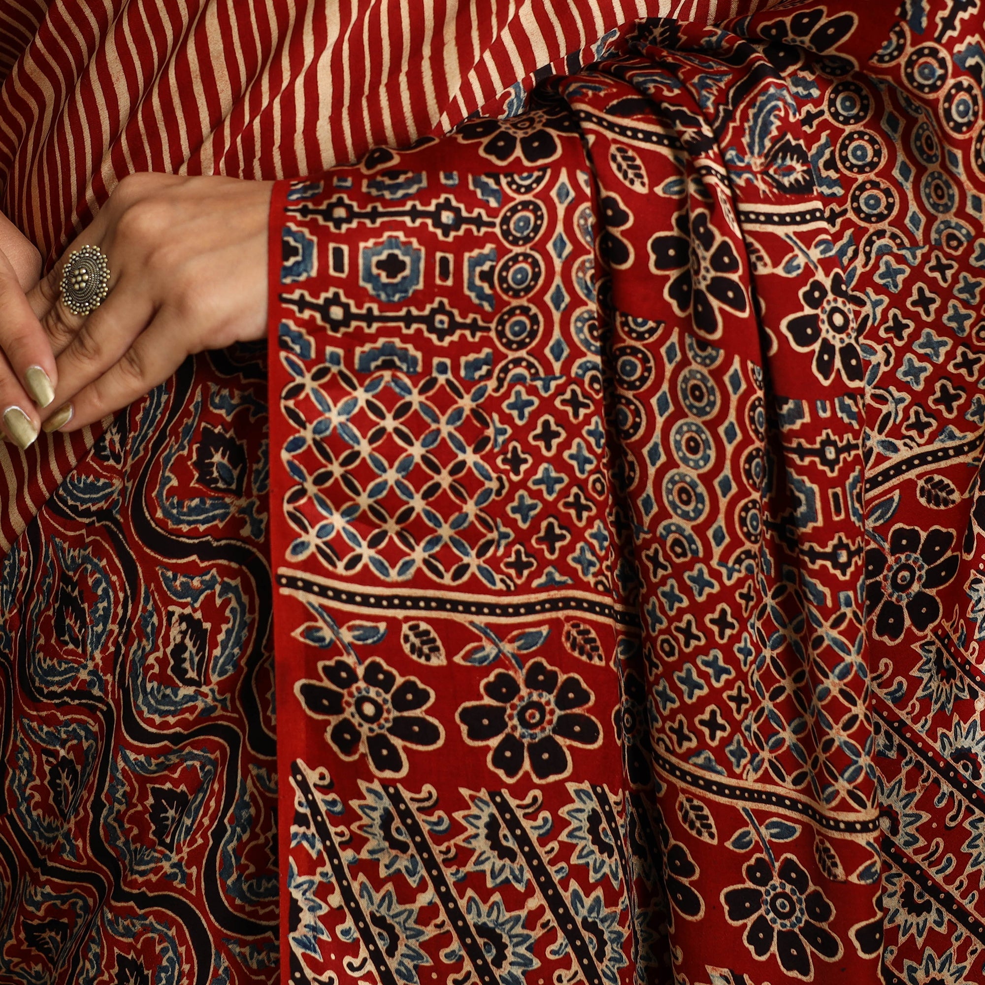 Ajrakh is a well-known traditional vegetable dyeing that resists block-printing techniques on cloth. Originated in Kutch, It is nearly around 4,500 years old practised by Khatri community of Kutch and Sikh.