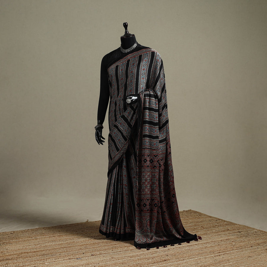 | Material | Traditional black ajrakh saree is hand block printed by Riyaz Abdulmajid Khatri. This saree is hand block printed by traditional ajrakh artisan using natural dyes, following a time-honoured craft that originated in Kutch, Gujarat. With a history spanning over 4,500 years, Ajrakh reflects India’s rich cultural legacy. Crafted in modal silk, the saree is detailed with a zari border and finished with charming tassels that add an elegant touch. It is well suited for festive occasions, cultural gatherings and graceful everyday wear. A Note on Handmade Beauty |