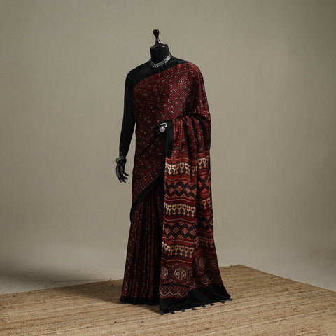 | Material | Traditional red ajrakh saree is hand block printed by Riyaz Abdulmajid Khatri. This saree is hand block printed by traditional ajrakh artisan using natural dyes, following a time-honoured craft that originated in Kutch, Gujarat. With a history spanning over 4,500 years, Ajrakh reflects India’s rich cultural legacy. Crafted in modal silk, the saree is detailed with a zari border and finished with charming tassels that add an elegant touch. It is well suited for festive occasions, cultural gatherings and graceful everyday wear. A Note on Handmade Beauty |