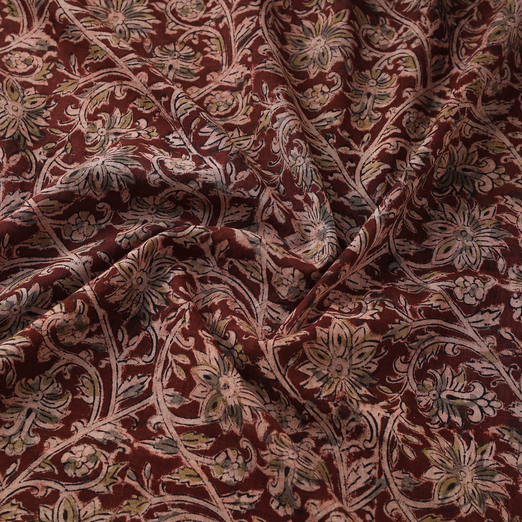 Kalamkari hand block printed pure mul cotton fabric is crafted using one of the oldest and most intricate printing techniques in India, dating back over 3,000 years. Skilled artisans use hand-carved wooden blocks dipped in natural dyes to create detailed Kalamkari motifs inspired by mythology, nature, and traditional patterns. Made in Pedana, Andhra Pradesh, this fabric reflects generations of practiced skill and cultural legacy. It is ideal for stitching garments, dupattas, or adding distinctive accents to home decor.