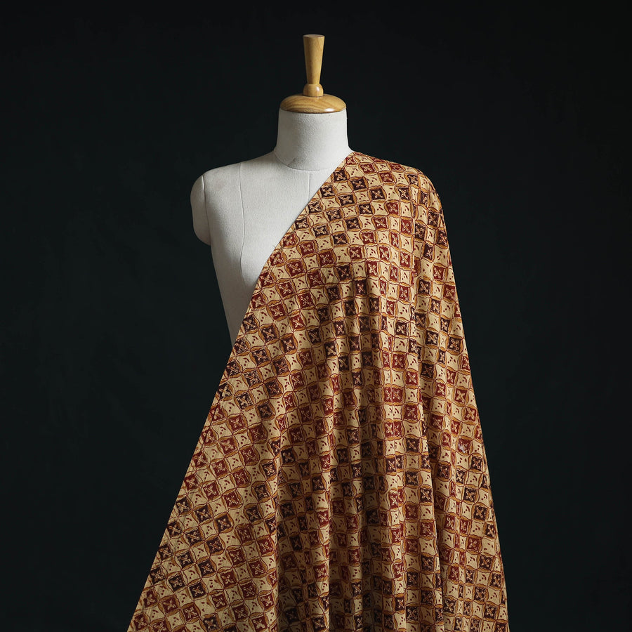 Kalamkari hand block printed pure mul cotton fabric is crafted using one of the oldest and most intricate printing techniques in India, dating back over 3,000 years. Skilled artisans use hand-carved wooden blocks dipped in natural dyes to create detailed Kalamkari motifs inspired by mythology, nature, and traditional patterns. Made in Pedana, Andhra Pradesh, this fabric reflects generations of practiced skill and cultural legacy. It is ideal for stitching garments, dupattas, or adding distinctive accents to home decor.