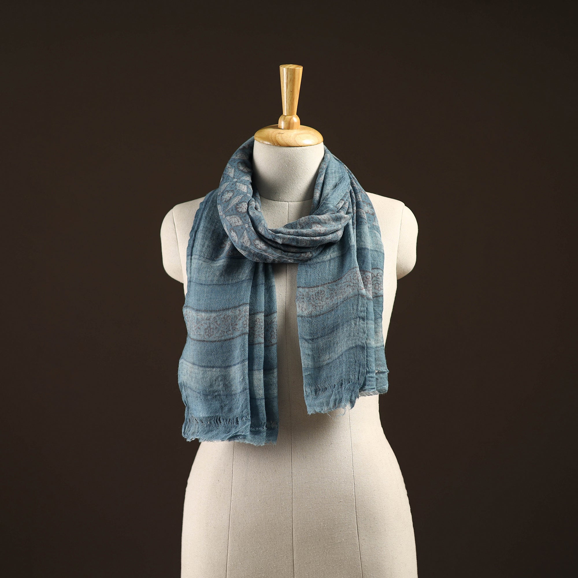 | Material | Blue akola hand block printed pure woolen stole created by skilled artisans from Akola village, Rajasthan. Each piece is printed using the traditional mud-resist block printing technique with natural dyes, giving it its distinct character and depth. The pure wool base adds comfortable warmth, making it suitable for cooler seasons. Its lightweight drape and detailed patterns make it a versatile accessory that pairs well with everyday outfits as well as more formal looks. |