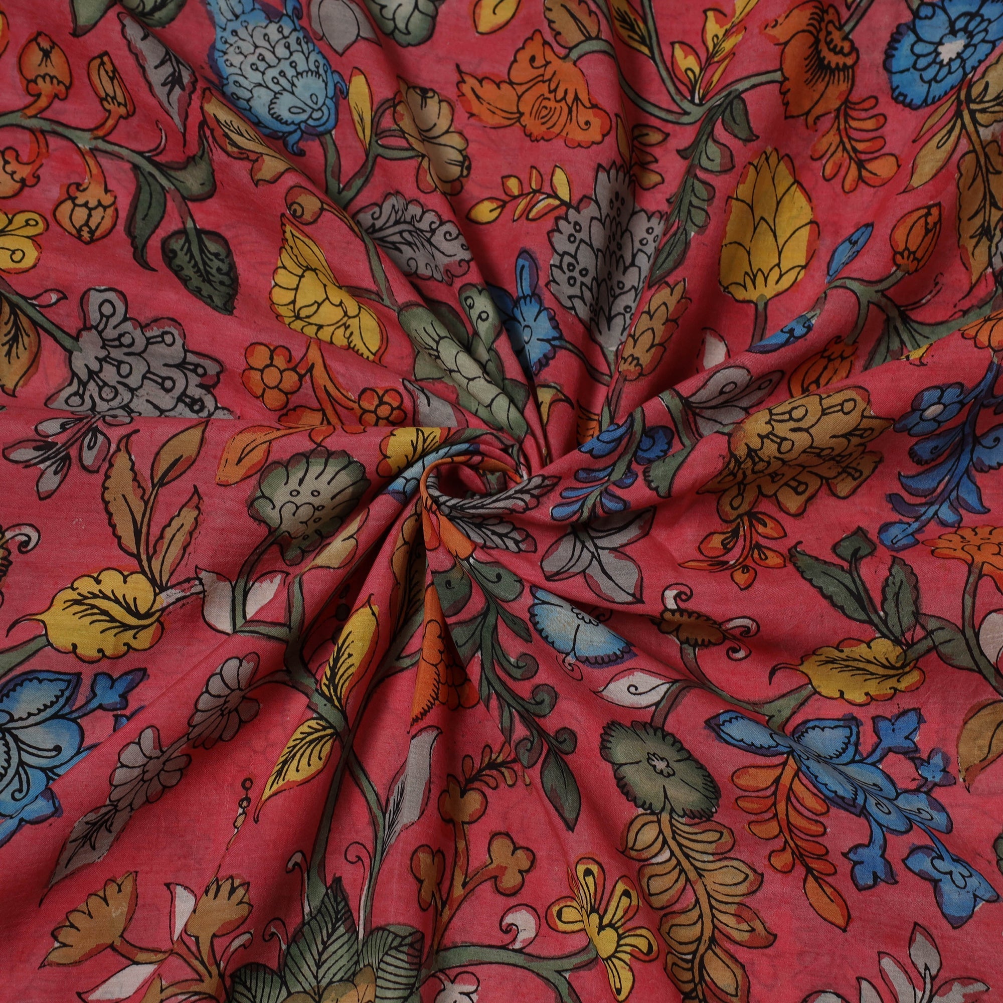 Red srikalahasti handpainted handloom chanderi silk cotton pen kalamkari fabric is a true reflection of India’s rich artisanal heritage. Created using natural colors, the srikalahasti style features intricate freehand drawings made with a kalam (pen), a skill passed down through generations of master artisans. This tradition has been practiced for over 200 years, making each piece one of a kind with fine detailing and the legacy of this centuries-old art form. Ideal for designing clothing, festive wear, or unique decor accents. The kalamkari craft lends a distinct odor to the product.