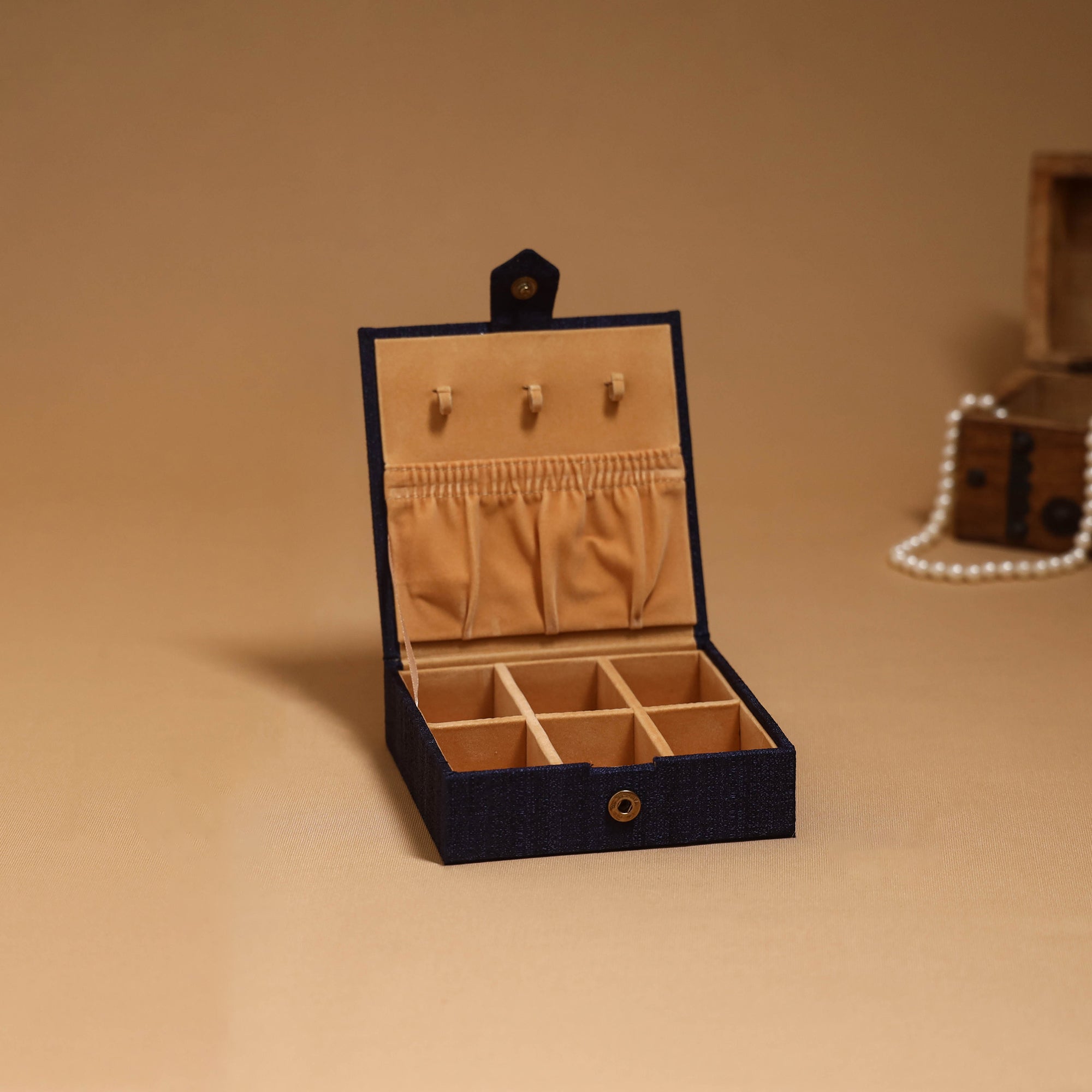Handpainted kalamkari jewellery box by Dwaraka Plus, crafted from craft board and embellished with cotton and ghicha silk. Soft velvet fabric is used inside the box. This piece showcases the art of kalamkari, where each design is hand-drawn using a “kalam” (bamboo stick) and filled with natural colours. This jewellery box features three utility hooks, an elastic inner pocket, and six compartments, keeping your rings, earrings, chains and accessories neatly organised and protected.