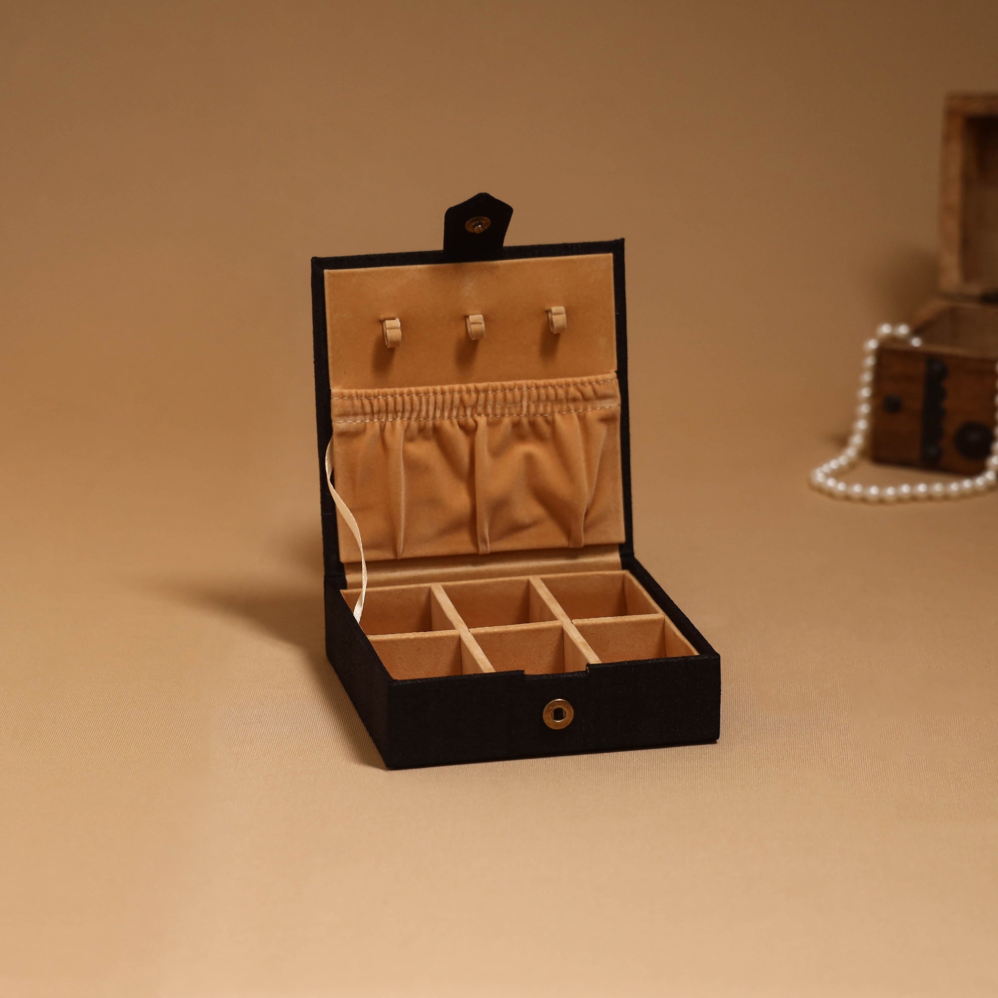 Handpainted kalamkari jewellery box by Dwaraka Plus, crafted from craft board and embellished with cotton and ghicha silk. Soft velvet fabric is used inside the box. This piece showcases the art of kalamkari, where each design is hand-drawn using a “kalam” (bamboo stick) and filled with natural colours. This jewellery box features three utility hooks, an elastic inner pocket, and six compartments, keeping your rings, earrings, chains and accessories neatly organised and protected.