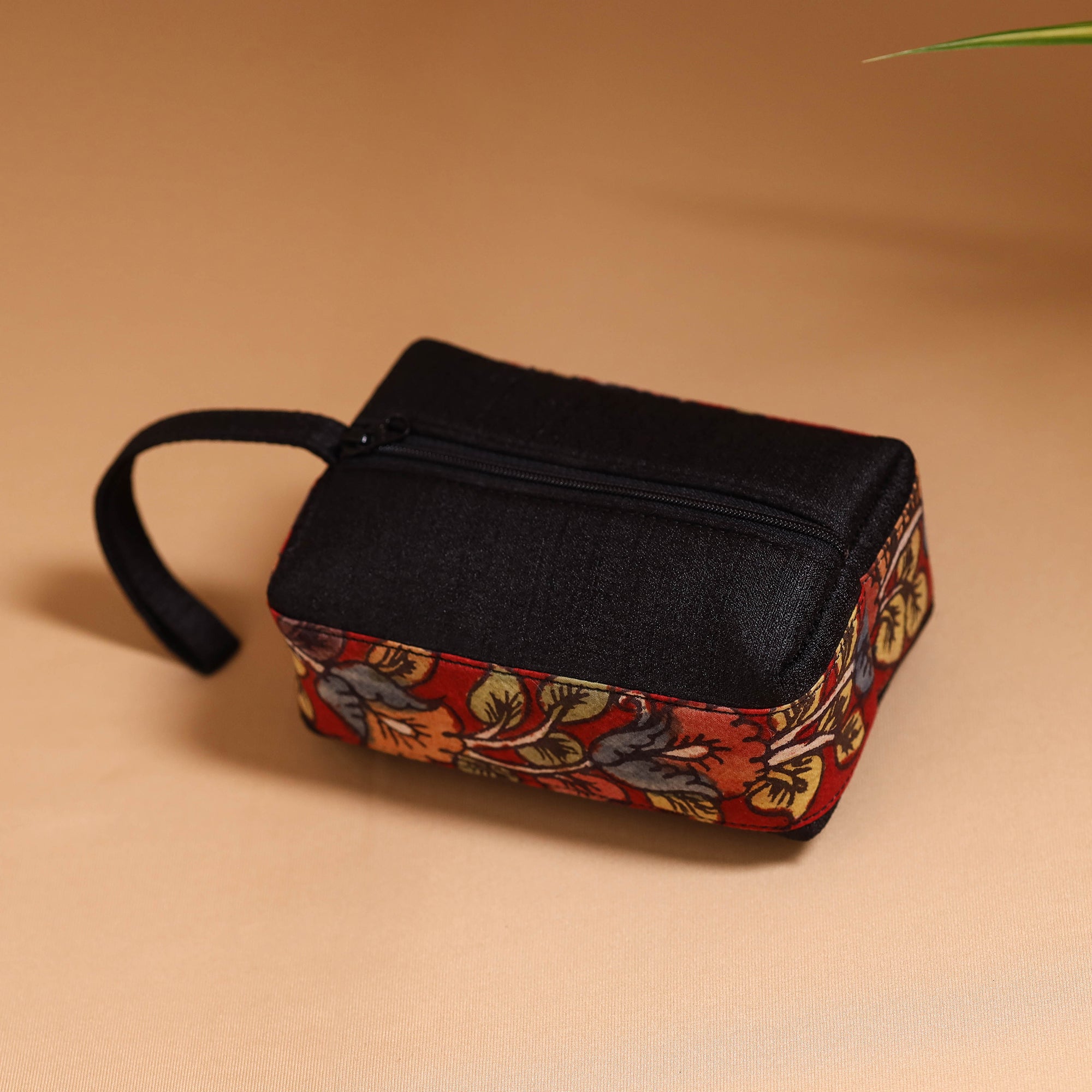 Handpainted kalamkari cosmetic/toiletry bag by Dwaraka Plus, crafted from cotton and ghicha silk. This travel bag showcases the art of kalamkari, where each design is hand-drawn using a “kalam” (bamboo stick) and filled with natural colours. This multipurpose pouch is a perfect blend of tradition and utility.