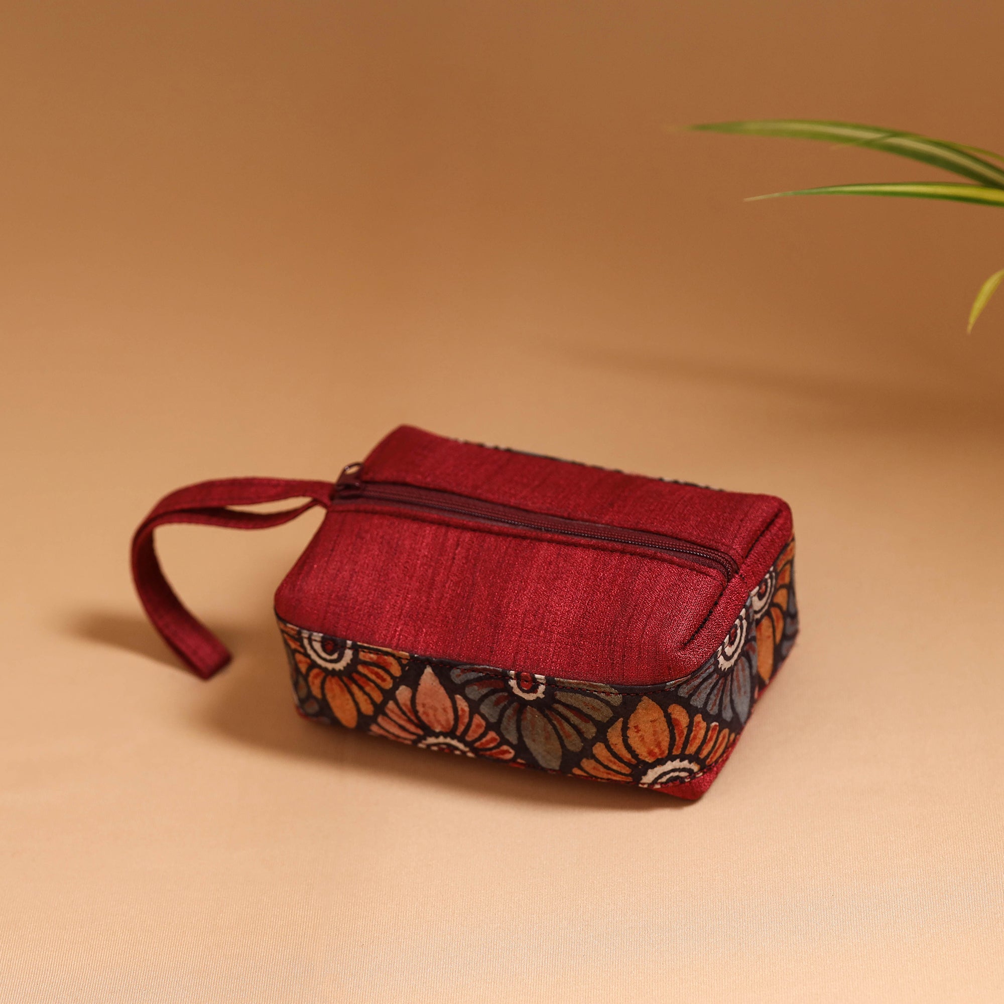 Handpainted kalamkari cosmetic/toiletry bag by Dwaraka Plus, crafted from cotton and ghicha silk. This travel bag showcases the art of kalamkari, where each design is hand-drawn using a “kalam” (bamboo stick) and filled with natural colours. This multipurpose pouch is a perfect blend of tradition and utility.