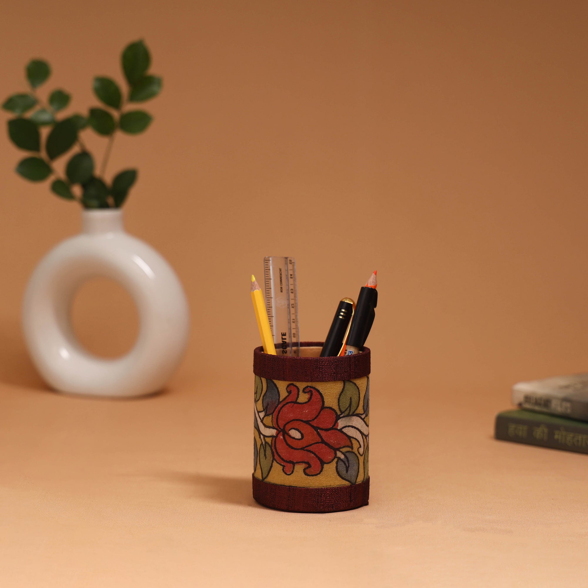 Handpainted kalamkari pen stand by Dwaraka Plus, made from craft board and embellished with cotton and ghicha silk. Soft velvet fabric is used inside the stand. This piece showcases the art of kalamkari, where each design is hand-drawn using a “kalam” (bamboo stick) and filled with natural colours. Designed to keep your desk organised, this pen stand neatly holds pens, pencils, markers and other stationery essentials while adding a touch of traditional artistry to your workspace.