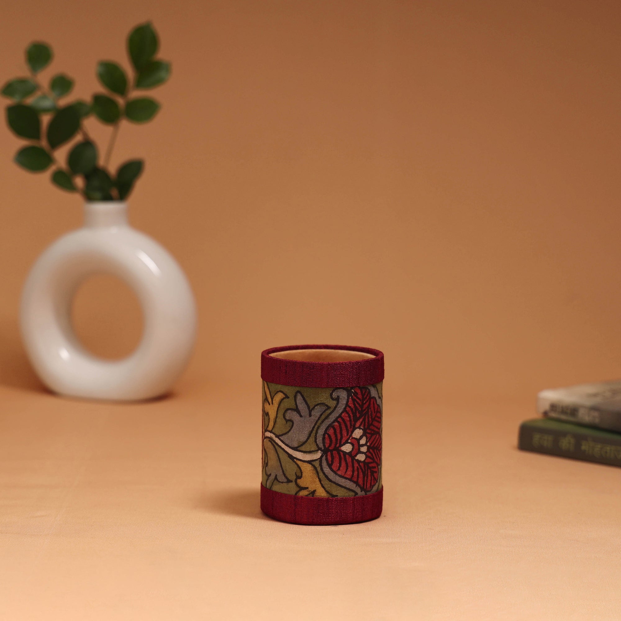 Red handpainted kalamkari pen stand by Dwaraka Plus, made from craft board and embellished with cotton and ghicha silk. Soft velvet fabric is used inside the stand. This piece showcases the art of kalamkari, where each design is hand-drawn using a “kalam” (bamboo stick) and filled with natural colours. Designed to keep your desk organised, this pen stand neatly holds pens, pencils, markers and other stationery essentials while adding a touch of traditional artistry to your workspace.