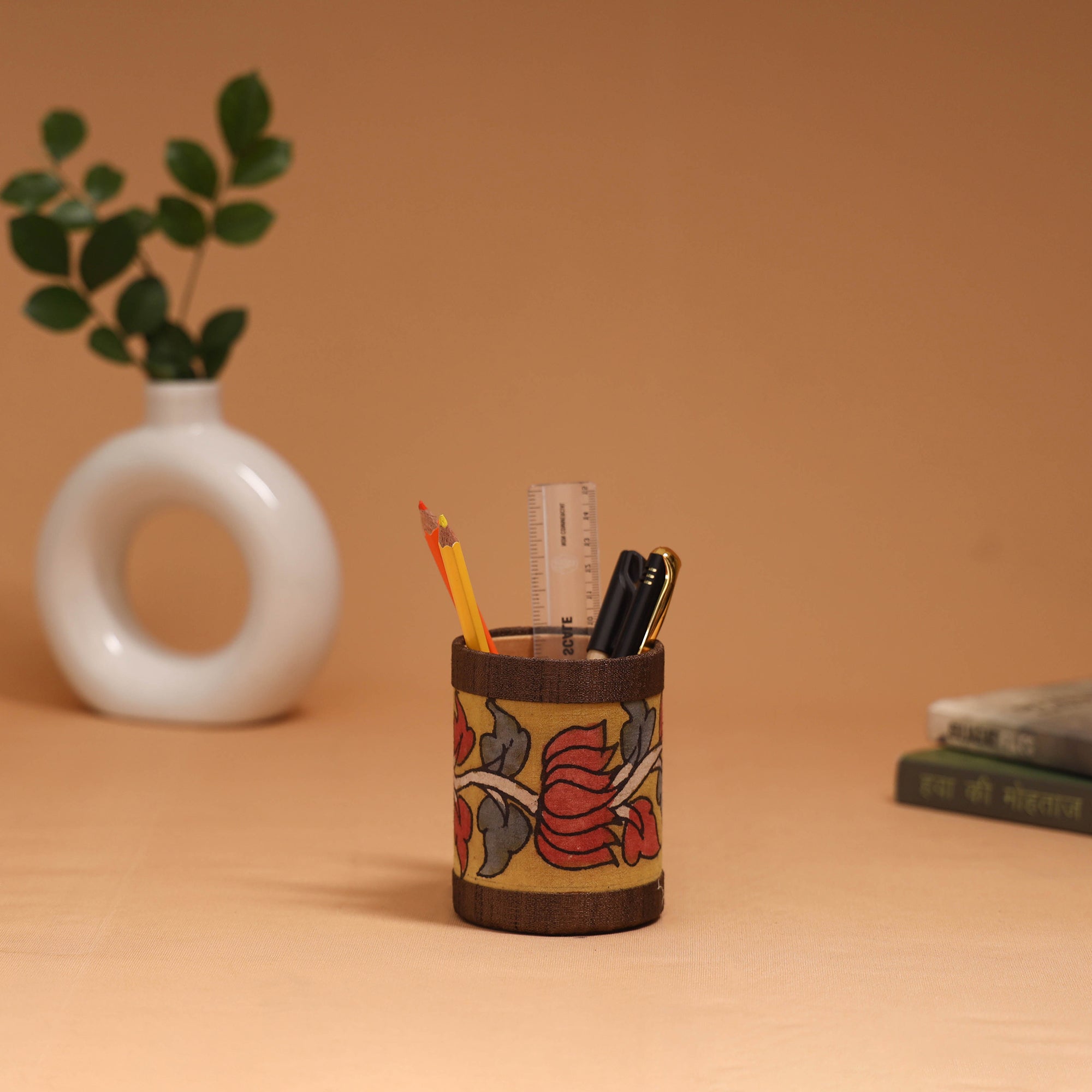 Handpainted kalamkari pen stand by Dwaraka Plus, made from craft board and embellished with cotton and ghicha silk. Soft velvet fabric is used inside the stand. This piece showcases the art of kalamkari, where each design is hand-drawn using a “kalam” (bamboo stick) and filled with natural colours. Designed to keep your desk organised, this pen stand neatly holds pens, pencils, markers and other stationery essentials while adding a touch of traditional artistry to your workspace.