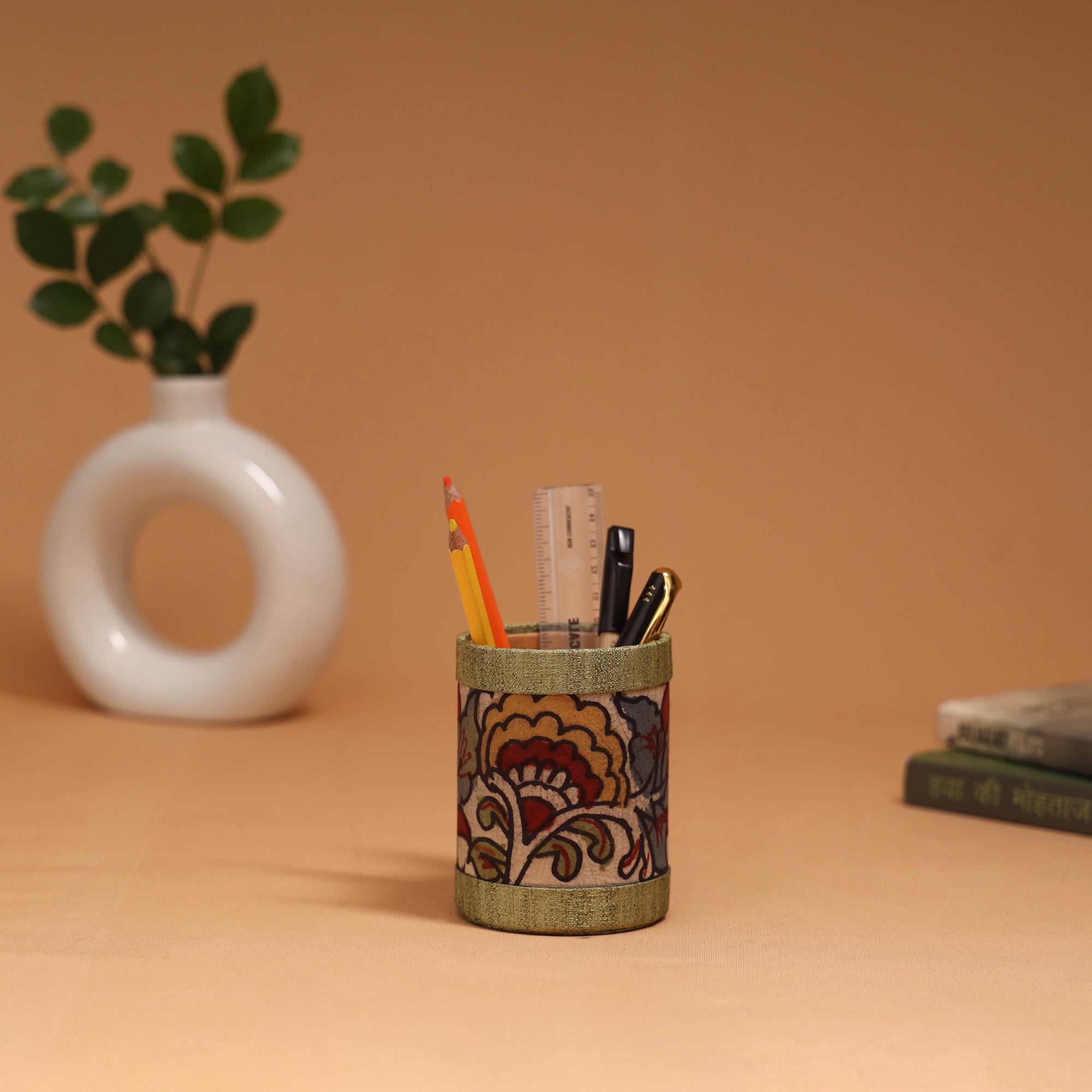Handpainted kalamkari pen stand by Dwaraka Plus, made from craft board and embellished with cotton and ghicha silk. Soft velvet fabric is used inside the stand. This piece showcases the art of kalamkari, where each design is hand-drawn using a “kalam” (bamboo stick) and filled with natural colours. Designed to keep your desk organised, this pen stand neatly holds pens, pencils, markers and other stationery essentials while adding a touch of traditional artistry to your workspace.