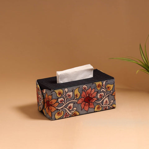 Handpainted kalamkari tissue box by Dwaraka Plus, crafted from thin craft board and embellished with cotton and ghicha silk. Soft velvet fabric is used inside the box. This piece showcases the art of kalamkari, where each design is hand-drawn using a “kalam” (bamboo stick) and filled with natural colours. A perfect blend of tradition and utility.