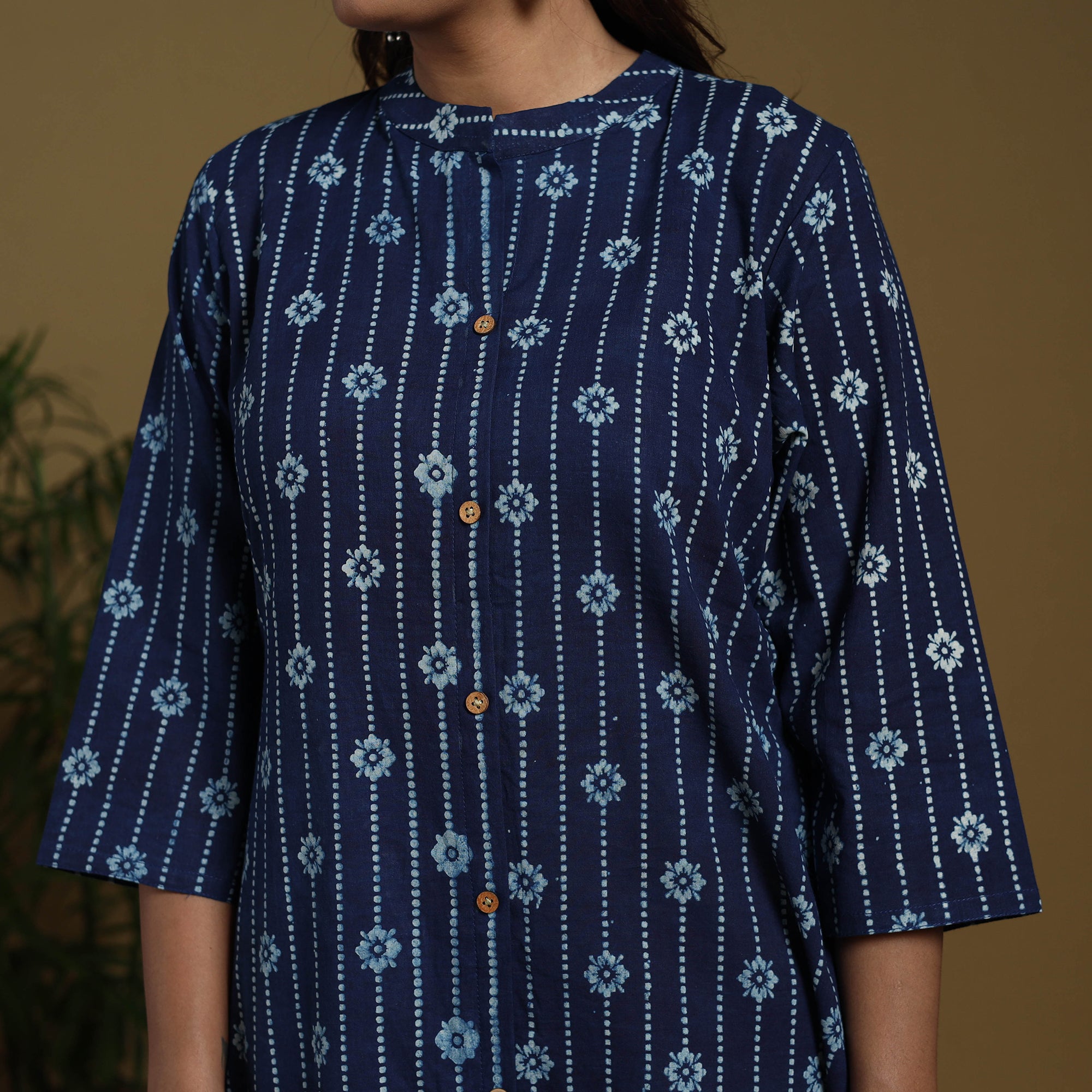 Look effortlessly beautiful in this blue A-line indigo bagru kurta. Made from naturally dyed cotton using the traditional bagru block printing technique, it combines classic design with everyday comfort. The soft, breathable fabric ensures all-day ease, and the side pocket adds a touch of practicality. Perfect for casual outings, workdays, or festive gatherings.