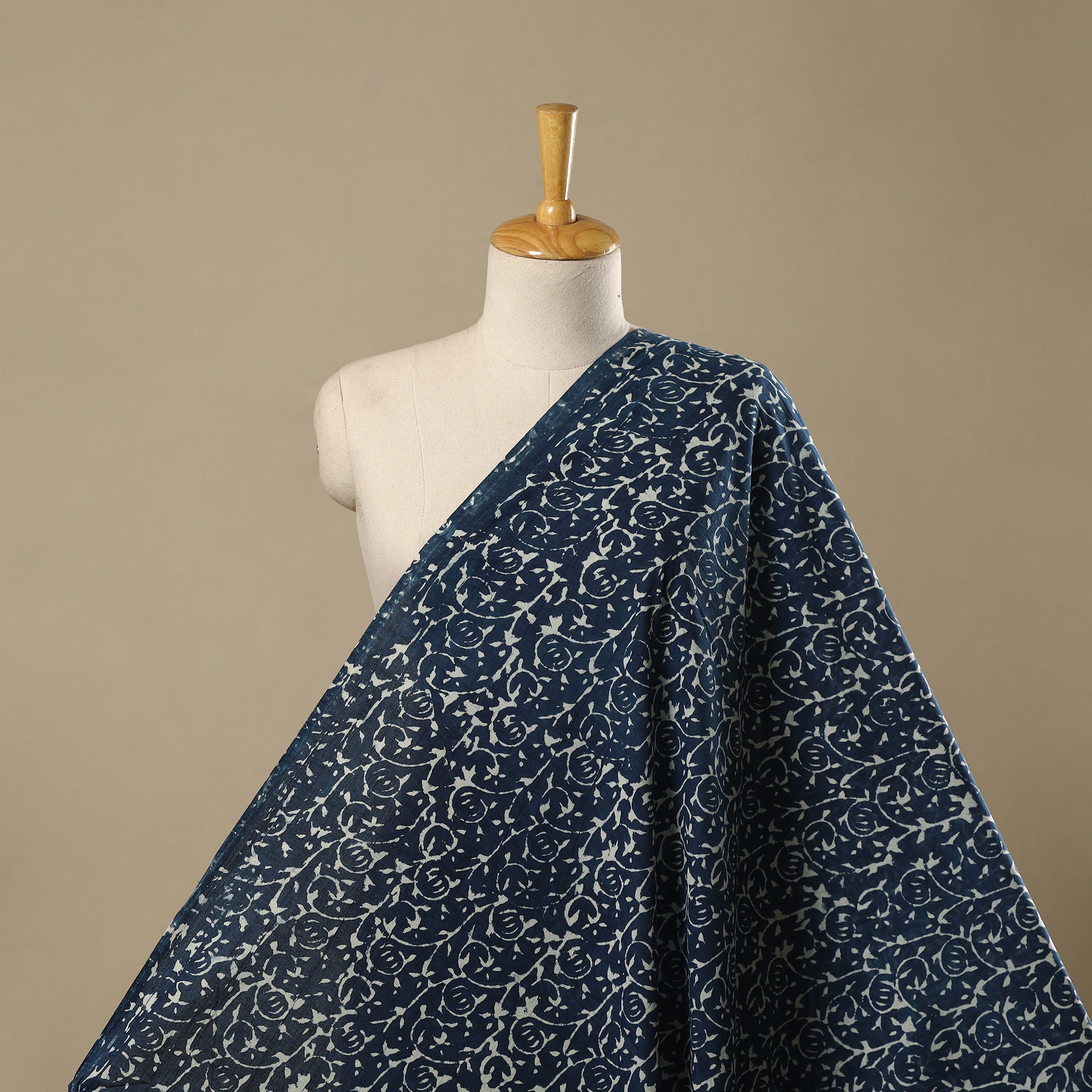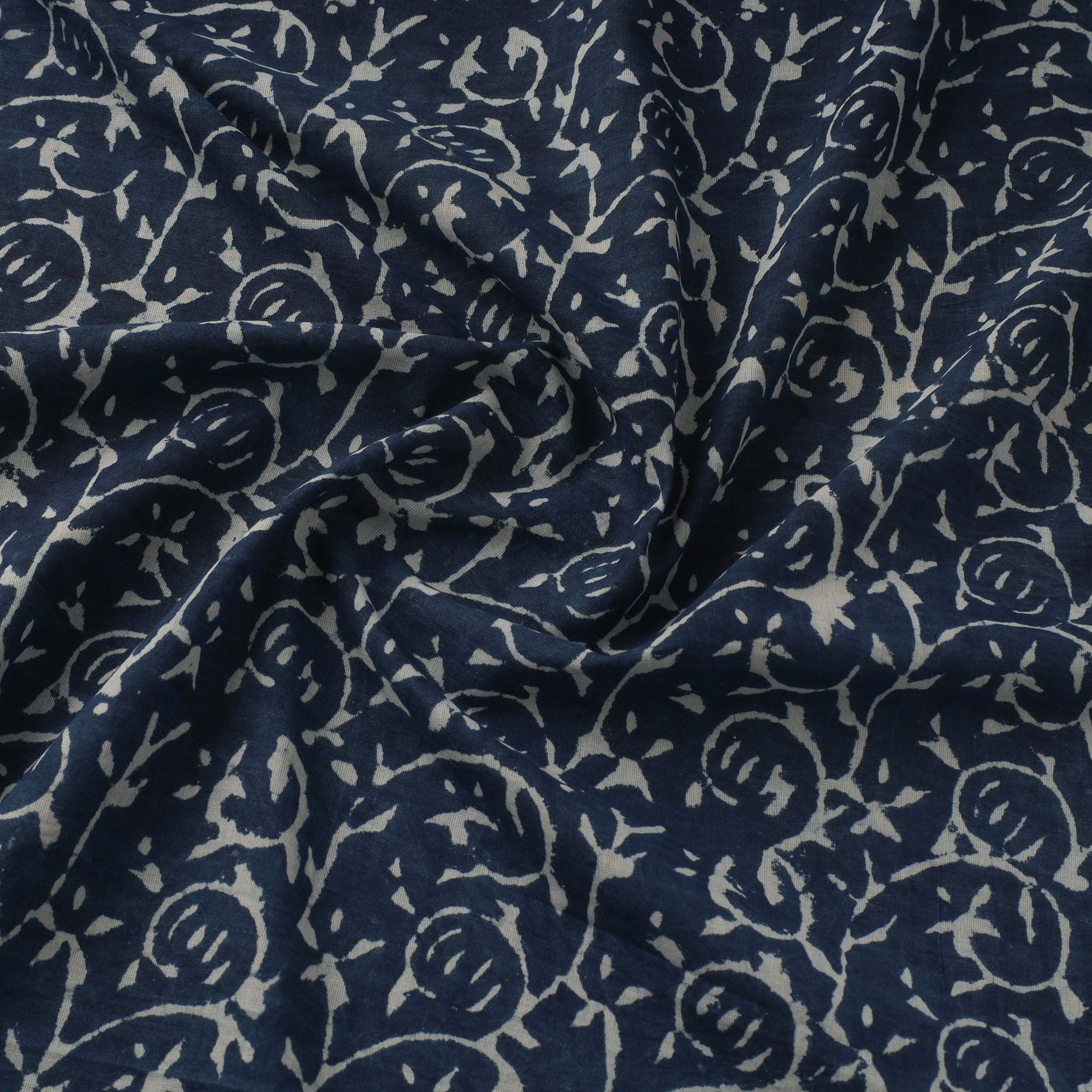 Blue pure mul cotton indigo bagru hand block print fabric comes from the village of Bagru in Rajasthan, where artisans have practiced the mud-resist printing technique for over 400–450 years. Printed on pure mul cotton using natural dyes, the fabric is created by applying a hand-prepared mud resist with carved wooden blocks. After dyeing, the resist is washed away to reveal distinct patterns. This fabric is ideal for garments, home decor and creative projects.